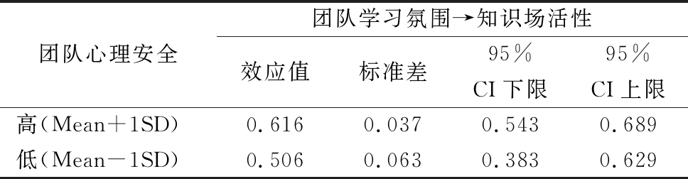 将团队心理安全纳入结构方程模型进行分析发现,团队学习氛围与团队心理安全的交互项对知识场活性的影响效应显著为正(β=0.088,p<0.05),说明团队心理安全正向调节团队学习氛围与知识场活性之间的关系。随后,以团队心理安全的均值分别加减一个标准差绘制简单斜率图,结果如表6和图3所示。由表6可知,团队心理安全分别处于高水平(β=0.616,p<0.001)和低水平(β=0.506,p<0.001)时,团队学习氛围对知识场活性的影响均显著,95% CI均不包含0,而高水平团队心理安全下的效应值更高。由图3可知,相比低水平团队心理安全,高水平团队心理安全下的效应线斜率更大。以上结果说明,高水平团队心理安全下,团队学习氛围对知识场活性的正向作用更强。因此,假设H5得到验证。