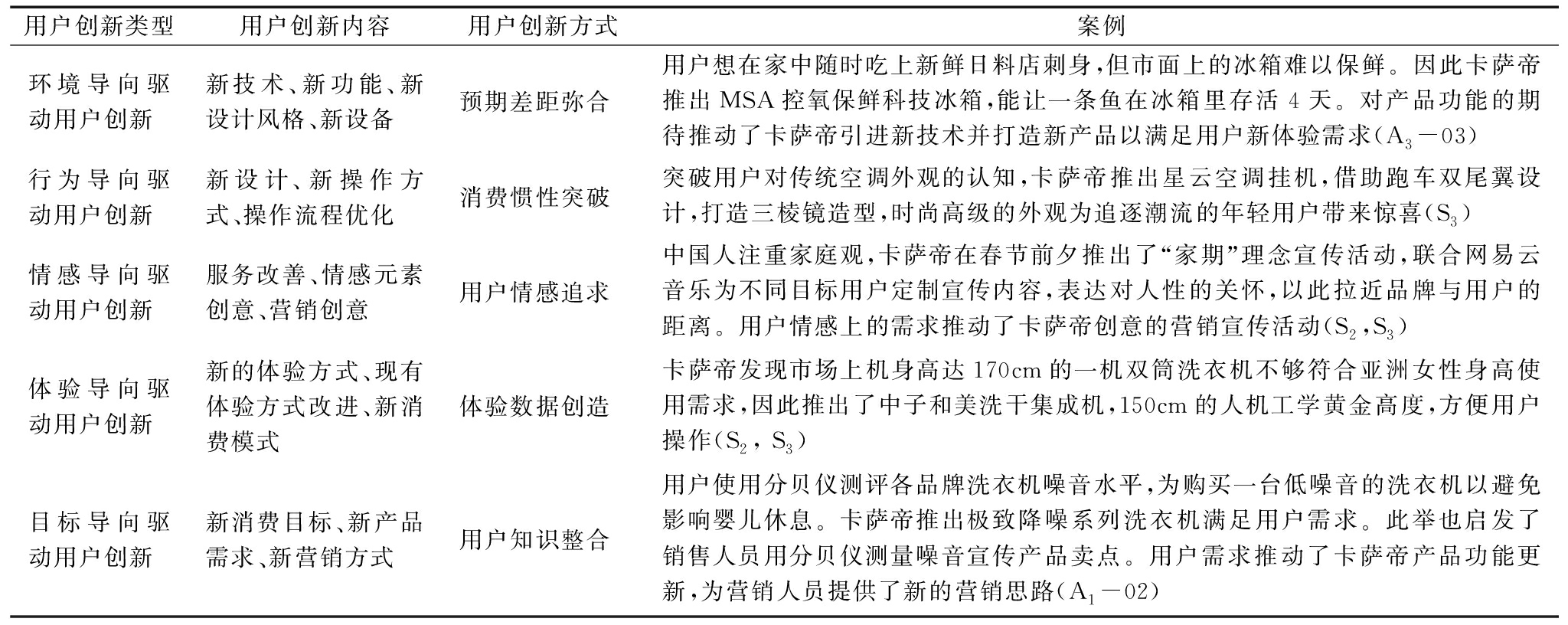 用户创新类型用户创新内容用户创新方式案例环境导向驱动用户创新新技术、新功能、新设计风格、新设备预期差距弥合用户想在家中随时吃上新鲜日料店刺身,但市面上的冰箱难以保鲜。因此卡萨帝推出MSA控氧保鲜科技冰箱,能让一条鱼在冰箱里存活4天。对产品功能的期待推动了卡萨帝引进新技术并打造新产品以满足用户新体验需求(A3-03)行为导向驱动用户创新新设计、新操作方式、操作流程优化消费惯性突破突破用户对传统空调外观的认知,卡萨帝推出星云空调挂机,借助跑车双尾翼设计,打造三棱镜造型,时尚高级的外观为追逐潮流的年轻用户带来惊喜(S3)情感导向驱动用户创新服务改善、情感元素创意、营销创意用户情感追求中国人注重家庭观,卡萨帝在春节前夕推出了“家期”理念宣传活动,联合网易云音乐为不同目标用户定制宣传内容,表达对人性的关怀,以此拉近品牌与用户的距离。用户情感上的需求推动了卡萨帝创意的营销宣传活动(S2,S3)体验导向驱动用户创新新的体验方式、现有体验方式改进、新消费模式体验数据创造卡萨帝发现市场上机身高达170cm的一机双筒洗衣机不够符合亚洲女性身高使用需求,因此推出了中子和美洗干集成机,150cm的人机工学黄金高度,方便用户操作(S2, S3)目标导向驱动用户创新新消费目标、新产品需求、新营销方式用户知识整合用户使用分贝仪测评各品牌洗衣机噪音水平,为购买一台低噪音的洗衣机以避免影响婴儿休息。卡萨帝推出极致降噪系列洗衣机满足用户需求。此举也启发了销售人员用分贝仪测量噪音宣传产品卖点。用户需求推动了卡萨帝产品功能更新,为营销人员提供了新的营销思路(A1-02)