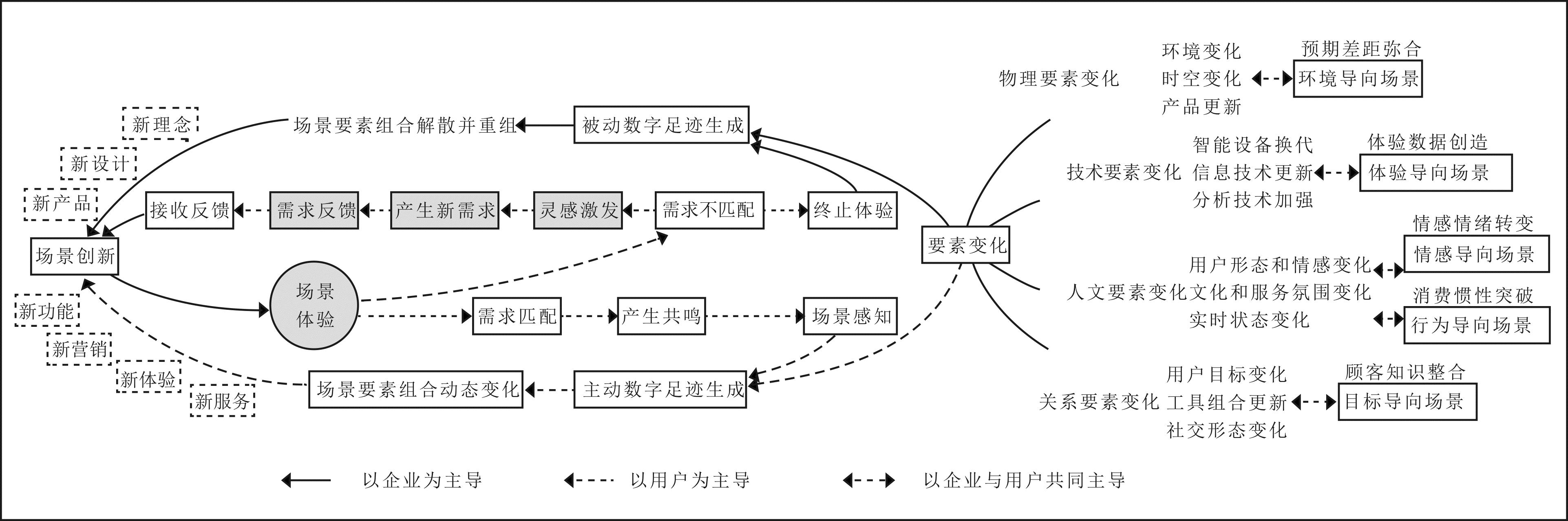 用户在具备物理、技术、人文和关系要素的初始消费场景中进行体验,并将需求与场景要素进行比对,若二者相匹配则继续体验。在企业与用户共同作用下,场景要素是动态变化的,原本与用户需求相匹配的场景要素与动态变化的场景要素相融合,通过主动数字足迹呈现或反馈给企业,如在社交媒体上发布帖子反映新需求,从而形成新消费场景。当用户发现需求与当前场景要素组合不匹配时,可能向企业反馈新的需求和问题,企业会根据反馈重新调整与用户需求不匹配的场景要素,或者创建符合用户需求的新场景要素,从而创造新消费场景。