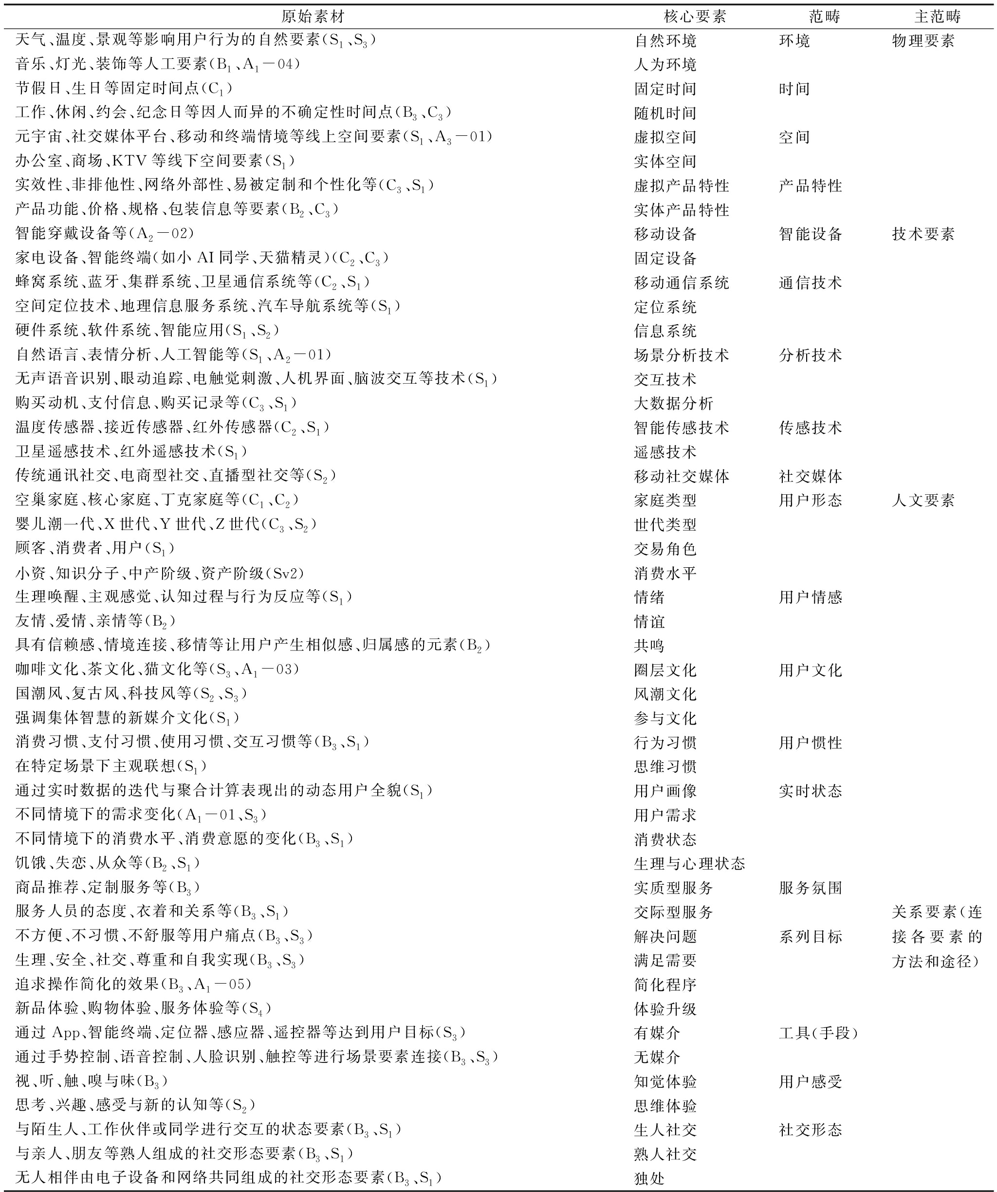原始素材核心要素范畴主范畴天气、温度、景观等影响用户行为的自然要素(S1、S3)自然环境环境物理要素音乐、灯光、装饰等人工要素(B1、A1-04)人为环境节假日、生日等固定时间点(C1)固定时间时间工作、休闲、约会、纪念日等因人而异的不确定性时间点(B3、C3)随机时间元宇宙、社交媒体平台、移动和终端情境等线上空间要素(S1、A3-01)虚拟空间空间办公室、商场、KTV等线下空间要素(S1)实体空间实效性、非排他性、网络外部性、易被定制和个性化等(C3、S1)虚拟产品特性产品特性产品功能、价格、规格、包装信息等要素(B2、C3)实体产品特性智能穿戴设备等(A2-02)移动设备智能设备技术要素家电设备、智能终端(如小AI同学、天猫精灵)(C2、C3)固定设备蜂窝系统、蓝牙、集群系统、卫星通信系统等(C2、S1)移动通信系统通信技术空间定位技术、地理信息服务系统、汽车导航系统等(S1)定位系统硬件系统、软件系统、智能应用(S1、S2)信息系统自然语言、表情分析、人工智能等(S1、A2-01)场景分析技术分析技术无声语音识别、眼动追踪、电触觉刺激、人机界面、脑波交互等技术(S1)交互技术购买动机、支付信息、购买记录等(C3、S1)大数据分析温度传感器、接近传感器、红外传感器(C2、S1)智能传感技术传感技术卫星遥感技术、红外遥感技术(S1)遥感技术传统通讯社交、电商型社交、直播型社交等(S2)移动社交媒体社交媒体空巢家庭、核心家庭、丁克家庭等(C1、C2) 家庭类型用户形态人文要素婴儿潮一代、X世代、Y世代、Z世代(C3、S2)世代类型顾客、消费者、用户(S1)交易角色小资、知识分子、中产阶级、资产阶级(Sv2)消费水平生理唤醒、主观感觉、认知过程与行为反应等(S1)情绪用户情感友情、爱情、亲情等(B2)情谊具有信赖感、情境连接、移情等让用户产生相似感、归属感的元素(B2)共鸣咖啡文化、茶文化、猫文化等(S3、A1-03)圈层文化用户文化国潮风、复古风、科技风等(S2、S3)风潮文化强调集体智慧的新媒介文化(S1)参与文化消费习惯、支付习惯、使用习惯、交互习惯等(B3、S1)行为习惯用户惯性在特定场景下主观联想(S1)思维习惯通过实时数据的迭代与聚合计算表现出的动态用户全貌(S1)用户画像实时状态不同情境下的需求变化(A1-01、S3)用户需求不同情境下的消费水平、消费意愿的变化(B3、S1)消费状态饥饿、失恋、从众等(B2、S1)生理与心理状态商品推荐、定制服务等(B3)实质型服务服务氛围服务人员的态度、衣着和关系等(B3、S1)交际型服务不方便、不习惯、不舒服等用户痛点(B3、S3)解决问题系列目标关系要素(连接各要素的方法和途径)生理、安全、社交、尊重和自我实现(B3、S3)满足需要追求操作简化的效果(B3、A1-05)简化程序新品体验、购物体验、服务体验等(S4)体验升级通过App、智能终端、定位器、感应器、遥控器等达到用户目标(S3)有媒介工具(手段)通过手势控制、语音控制、人脸识别、触控等进行场景要素连接(B3、S3)无媒介视、听、触、嗅与味(B3)知觉体验用户感受思考、兴趣、感受与新的认知等(S2)思维体验与陌生人、工作伙伴或同学进行交互的状态要素(B3、S1)生人社交社交形态与亲人、朋友等熟人组成的社交形态要素(B3、S1)熟人社交无人相伴由电子设备和网络共同组成的社交形态要素(B3、S1)独处