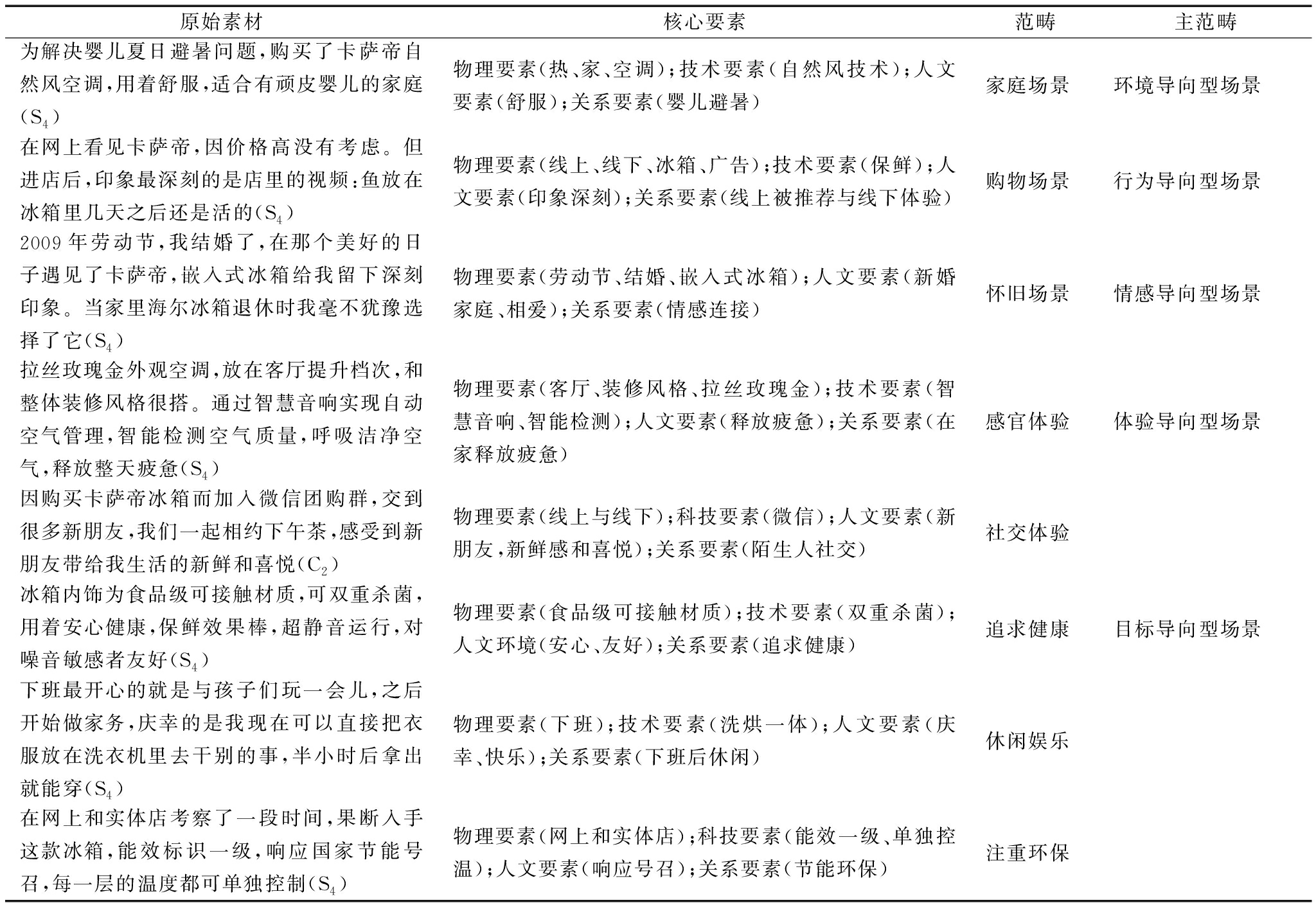 原始素材核心要素范畴主范畴为解决婴儿夏日避暑问题,购买了卡萨帝自然风空调,用着舒服,适合有顽皮婴儿的家庭(S4)物理要素(热、家、空调);技术要素(自然风技术);人文要素(舒服);关系要素(婴儿避暑)家庭场景环境导向型场景在网上看见卡萨帝,因价格高没有考虑。但进店后,印象最深刻的是店里的视频:鱼放在冰箱里几天之后还是活的(S4)物理要素(线上、线下、冰箱、广告);技术要素(保鲜);人文要素(印象深刻);关系要素(线上被推荐与线下体验)购物场景行为导向型场景2009年劳动节,我结婚了,在那个美好的日子遇见了卡萨帝,嵌入式冰箱给我留下深刻印象。当家里海尔冰箱退休时我毫不犹豫选择了它(S4)物理要素(劳动节、结婚、嵌入式冰箱);人文要素(新婚家庭、相爱);关系要素(情感连接)怀旧场景情感导向型场景拉丝玫瑰金外观空调,放在客厅提升档次,和整体装修风格很搭。通过智慧音响实现自动空气管理,智能检测空气质量,呼吸洁净空气,释放整天疲惫(S4)物理要素(客厅、装修风格、拉丝玫瑰金);技术要素(智慧音响、智能检测);人文要素(释放疲惫);关系要素(在家释放疲惫) 感官体验体验导向型场景因购买卡萨帝冰箱而加入微信团购群,交到很多新朋友,我们一起相约下午茶,感受到新朋友带给我生活的新鲜和喜悦(C2)物理要素(线上与线下);科技要素(微信);人文要素(新朋友,新鲜感和喜悦);关系要素(陌生人社交)社交体验冰箱内饰为食品级可接触材质,可双重杀菌,用着安心健康,保鲜效果棒,超静音运行,对噪音敏感者友好(S4)物理要素(食品级可接触材质);技术要素(双重杀菌);人文环境(安心、友好);关系要素(追求健康)追求健康目标导向型场景下班最开心的就是与孩子们玩一会儿,之后开始做家务,庆幸的是我现在可以直接把衣服放在洗衣机里去干别的事,半小时后拿出就能穿(S4)物理要素(下班);技术要素(洗烘一体);人文要素(庆幸、快乐);关系要素(下班后休闲)休闲娱乐在网上和实体店考察了一段时间,果断入手这款冰箱,能效标识一级,响应国家节能号召,每一层的温度都可单独控制(S4)物理要素(网上和实体店);科技要素(能效一级、单独控温);人文要素(响应号召);关系要素(节能环保)注重环保
