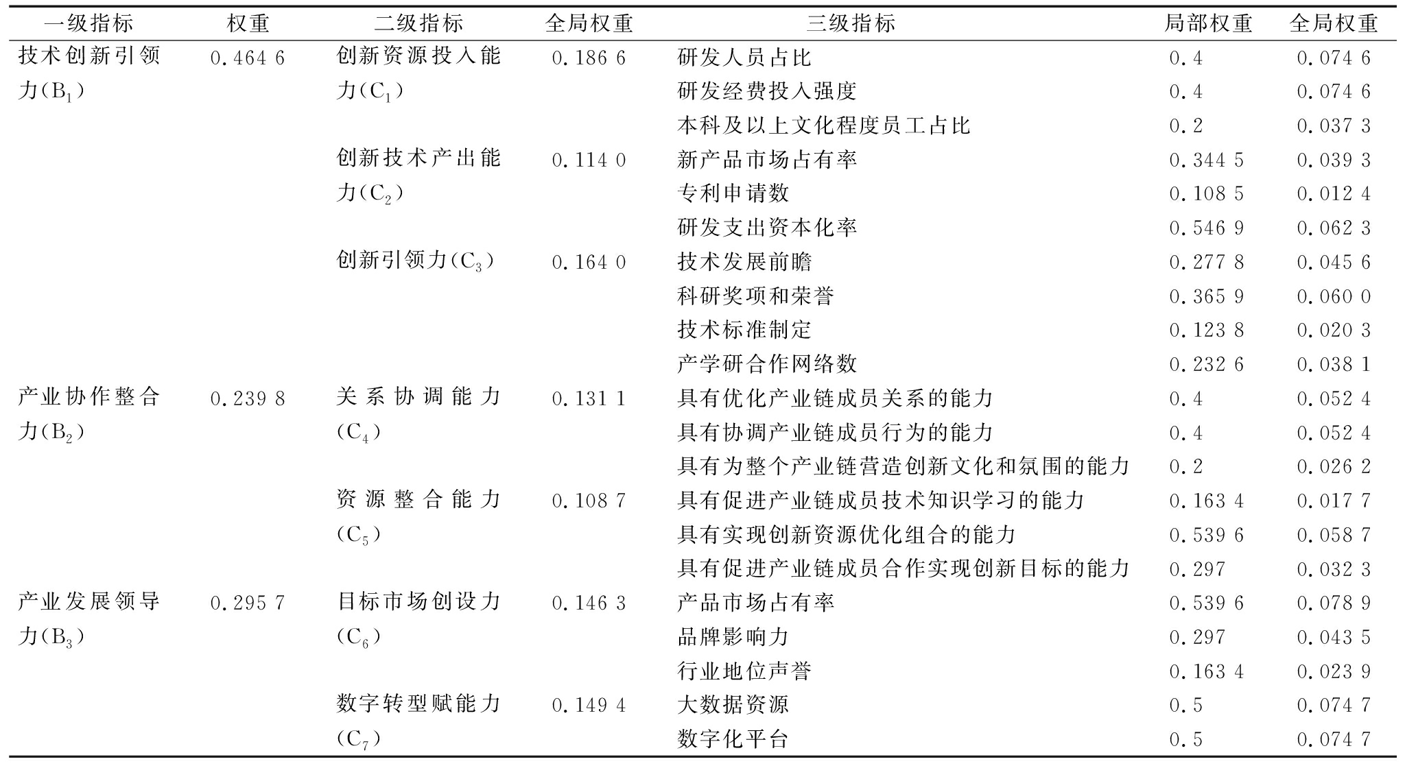 一级指标权重二级指标全局权重三级指标 局部权重全局权重技术创新引领力(B1)0.464 6创新资源投入能力(C1)0.186 6研发人员占比0.4 0.074 6 研发经费投入强度0.40.074 6本科及以上文化程度员工占比0.20.037 3 创新技术产出能力(C2)0.114 0新产品市场占有率0.344 50.039 3 专利申请数0.108 50.012 4研发支出资本化率0.546 90.062 3 创新引领力(C3)0.164 0技术发展前瞻0.277 80.045 6科研奖项和荣誉0.365 90.060 0技术标准制定0.123 80.020 3产学研合作网络数0.232 60.038 1产业协作整合力(B2)0.239 8关系协调能力(C4)0.131 1具有优化产业链成员关系的能力0.40.052 4 具有协调产业链成员行为的能力0.40.052 4 具有为整个产业链营造创新文化和氛围的能力0.20.026 2 资源整合能力(C5)0.108 7具有促进产业链成员技术知识学习的能力0.163 40.017 7 具有实现创新资源优化组合的能力0.539 60.058 7 具有促进产业链成员合作实现创新目标的能力0.2970.032 3 产业发展领导力(B3)0.295 7目标市场创设力(C6)0.146 3产品市场占有率0.539 60.078 9品牌影响力0.2970.043 5 行业地位声誉0.163 40.023 9 数字转型赋能力(C7)0.149 4大数据资源0.50.074 7 数字化平台0.50.074 7