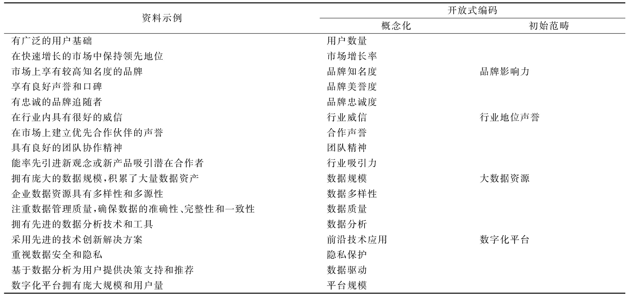 资料示例开放式编码概念化初始范畴有广泛的用户基础用户数量在快速增长的市场中保持领先地位市场增长率市场上享有较高知名度的品牌品牌知名度品牌影响力享有良好声誉和口碑品牌美誉度有忠诚的品牌追随者品牌忠诚度在行业内具有很好的威信行业威信行业地位声誉在市场上建立优先合作伙伴的声誉合作声誉具有良好的团队协作精神团队精神能率先引进新观念或新产品吸引潜在合作者行业吸引力拥有庞大的数据规模,积累了大量数据资产数据规模大数据资源企业数据资源具有多样性和多源性数据多样性注重数据管理质量,确保数据的准确性、完整性和一致性数据质量拥有先进的数据分析技术和工具数据分析采用先进的技术创新解决方案前沿技术应用数字化平台重视数据安全和隐私隐私保护基于数据分析为用户提供决策支持和推荐数据驱动数字化平台拥有庞大规模和用户量平台规模