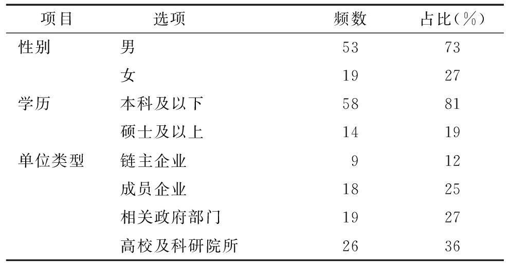 项目选项 频数占比(%)性别男5373女1927学历本科及以下5881硕士及以上1419单位类型链主企业912成员企业1825相关政府部门1927高校及科研院所2636