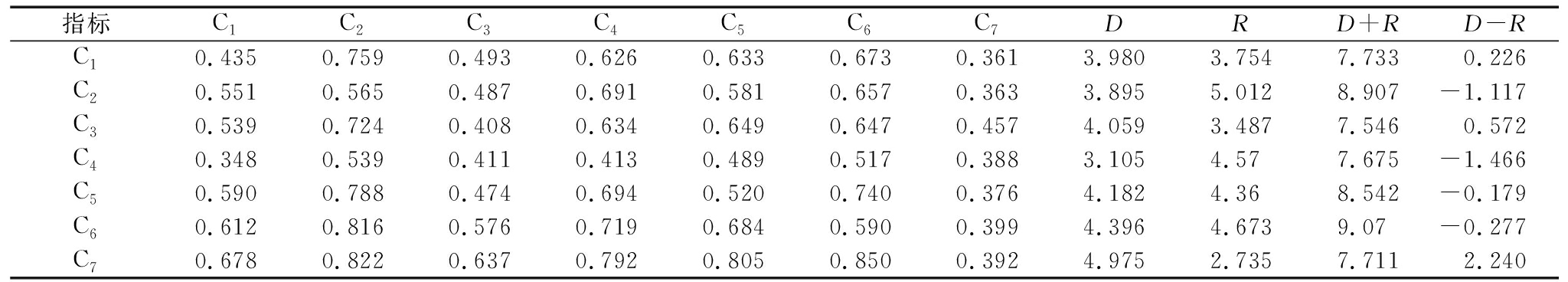 指标C1C2C3C4C5C6C7DRD+RD-RC10.4350.7590.4930.6260.6330.6730.3613.9803.7547.7330.226C20.5510.5650.4870.6910.5810.6570.3633.8955.0128.907-1.117C30.5390.7240.4080.6340.6490.6470.4574.0593.4877.5460.572C40.3480.5390.4110.4130.4890.5170.3883.1054.577.675-1.466C50.5900.7880.4740.6940.5200.7400.3764.1824.368.542-0.179C60.6120.8160.5760.7190.6840.5900.3994.3964.6739.07-0.277C70.6780.8220.6370.7920.8050.8500.3924.9752.7357.7112.240