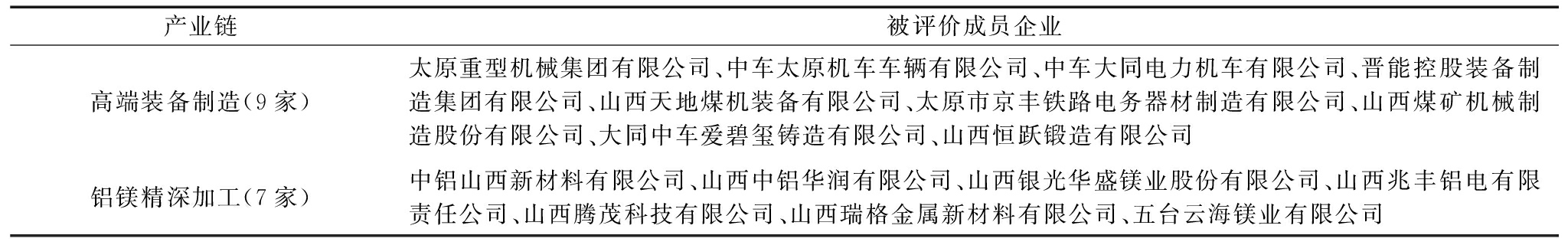 产业链被评价成员企业高端装备制造(9家)太原重型机械集团有限公司、中车太原机车车辆有限公司、中车大同电力机车有限公司、晋能控股装备制造集团有限公司、山西天地煤机装备有限公司、太原市京丰铁路电务器材制造有限公司、山西煤矿机械制造股份有限公司、大同中车爱碧玺铸造有限公司、山西恒跃锻造有限公司铝镁精深加工(7家)中铝山西新材料有限公司、山西中铝华润有限公司、山西银光华盛镁业股份有限公司、山西兆丰铝电有限责任公司、山西腾茂科技有限公司、山西瑞格金属新材料有限公司、五台云海镁业有限公司