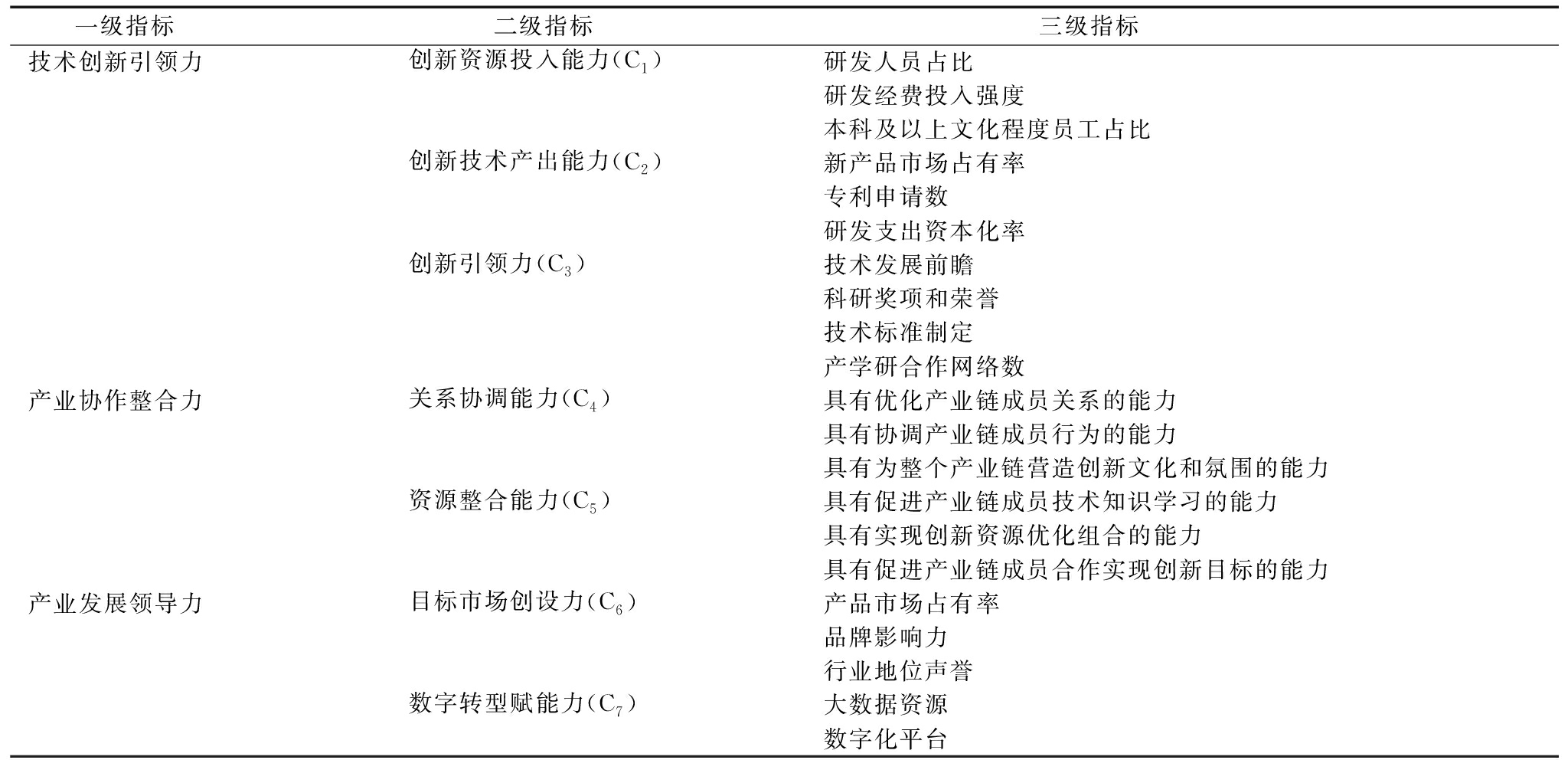 一级指标 二级指标 三级指标 技术创新引领力创新资源投入能力(C1)研发人员占比研发经费投入强度本科及以上文化程度员工占比创新技术产出能力(C2)新产品市场占有率专利申请数研发支出资本化率创新引领力(C3)技术发展前瞻科研奖项和荣誉技术标准制定产学研合作网络数产业协作整合力关系协调能力(C4)具有优化产业链成员关系的能力具有协调产业链成员行为的能力具有为整个产业链营造创新文化和氛围的能力资源整合能力(C5)具有促进产业链成员技术知识学习的能力具有实现创新资源优化组合的能力具有促进产业链成员合作实现创新目标的能力产业发展领导力目标市场创设力(C6)产品市场占有率品牌影响力行业地位声誉数字转型赋能力(C7)大数据资源数字化平台