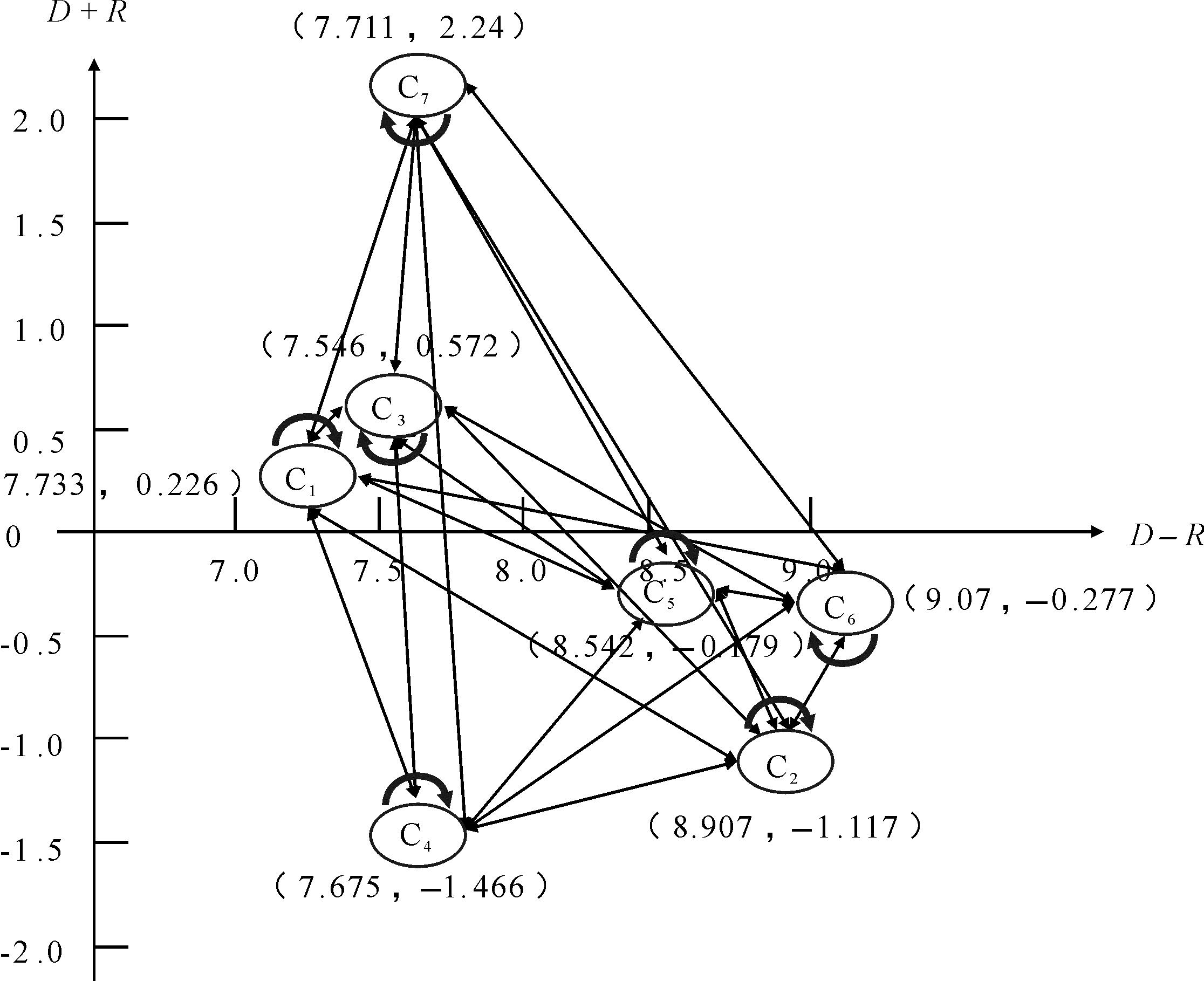 (3)绘制因果关系图。参考孙晶[17]确定阈值的方法,将系统中影响关系较强部分所包含的最小影响关系作为阈值,低于此值表示两指标间的关联程度可忽略不计。之后,根据公式(4)—(6)计算一级指标的影响度D、被影响度R、中心度D+R以及原因度D-R,如表6所示。中心度反映某指标在系统中的作用大小,该值越大说明指标越重要;原因度体现该指标对其它指标的影响程度。根据D+R、D-R构造一级指标因果图,得出指标间的关联性,如图2所示。其中,箭头指向表示其它指标对该指标的影响,指向自身的箭头代表自相关。