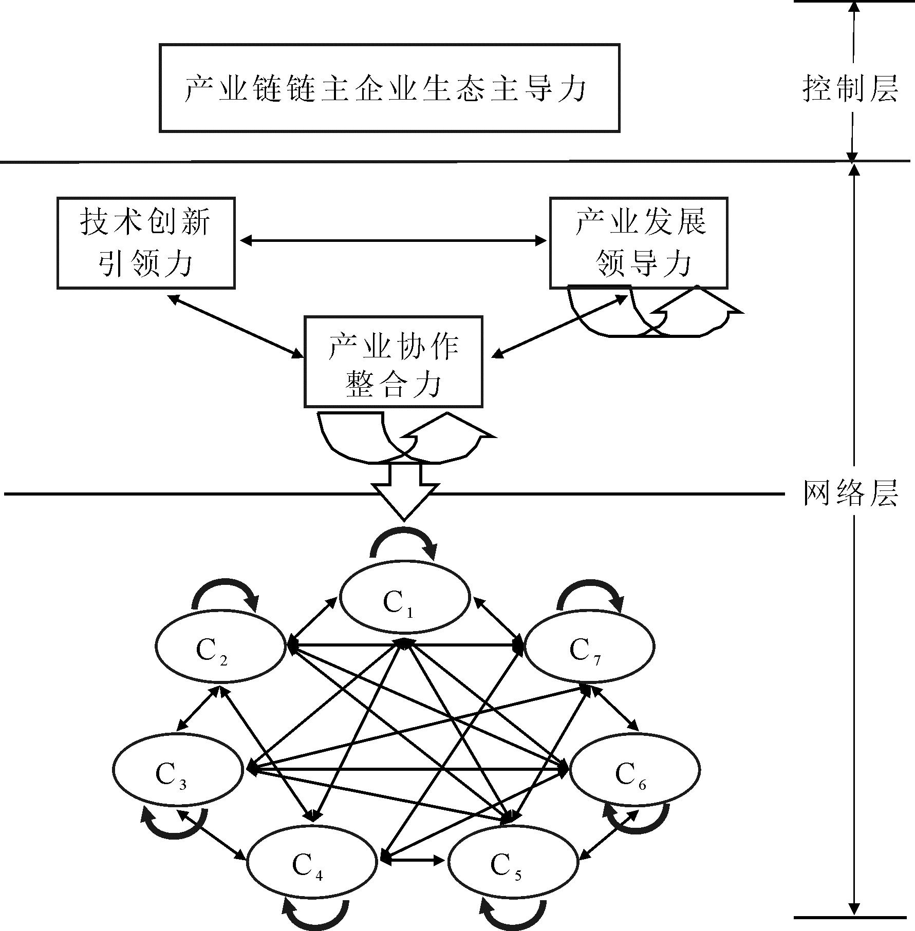 (2)产业协作整合力。链主企业可达到产业链上各个节点,集合产业链各规模企业生产、加工、销售等环节,形成以自身为核心的网状产业链结构。链主企业发挥产业协作整合力,一方面要对产业链各成员企业关系进行协调和优化,建立持久互惠的合作关系,最终实现创新生态系统投入与产出均衡的理想状态;另一方面也要整合产业链现有资源实现价值共创,调动成员企业为实现共同目标投入资源的积极性,合力推动生态系统高效运转。