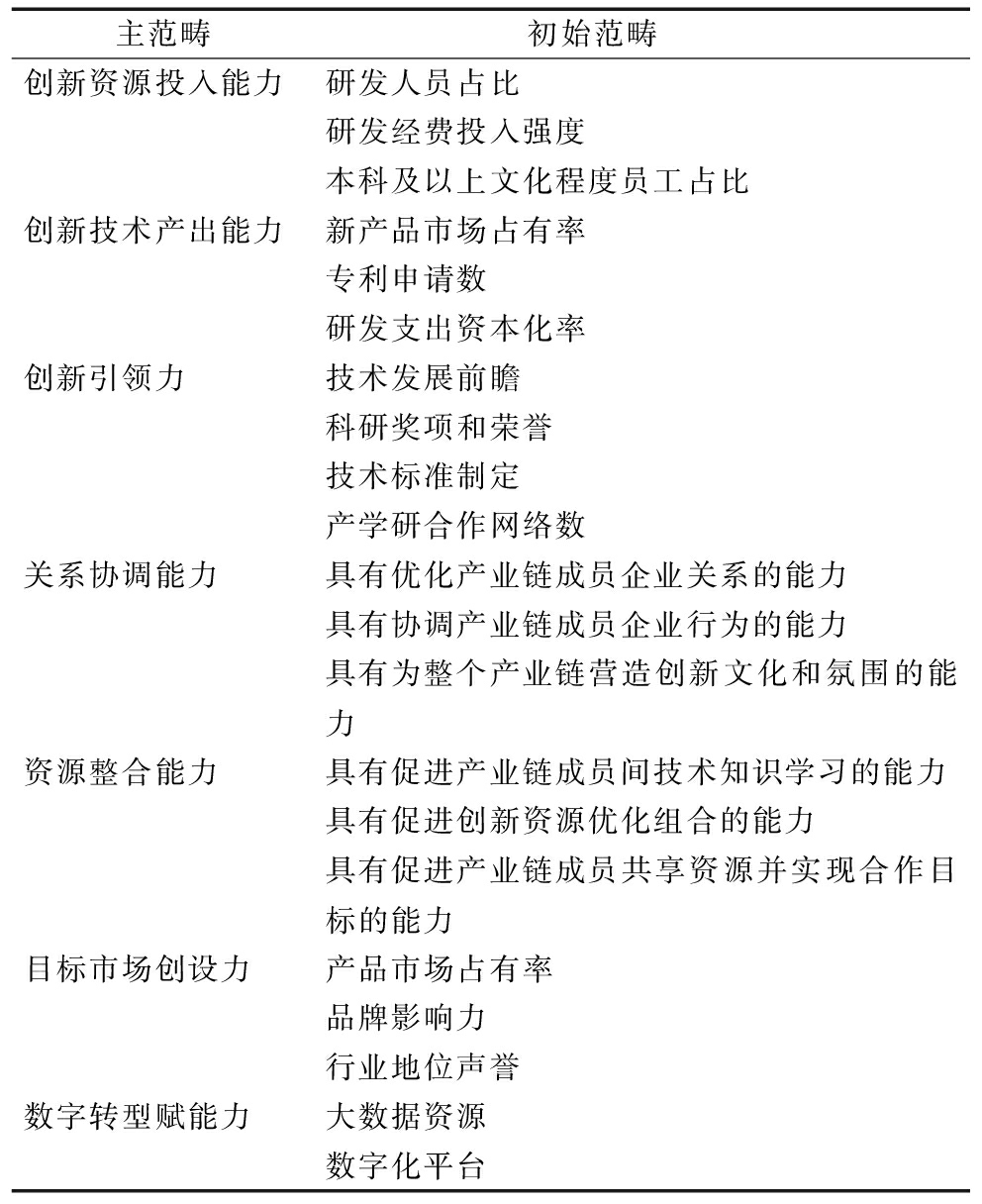选择性编码的主要作用和目的是整合主范畴,提炼核心范畴,从而建立核心范畴之间的联系[14]。本文将7个主范畴归纳为技术创新引领力、产业协作整合力、产业发展领导力3个核心范畴,并将其作为链主企业生态主导力评价指标的3个一级指标。