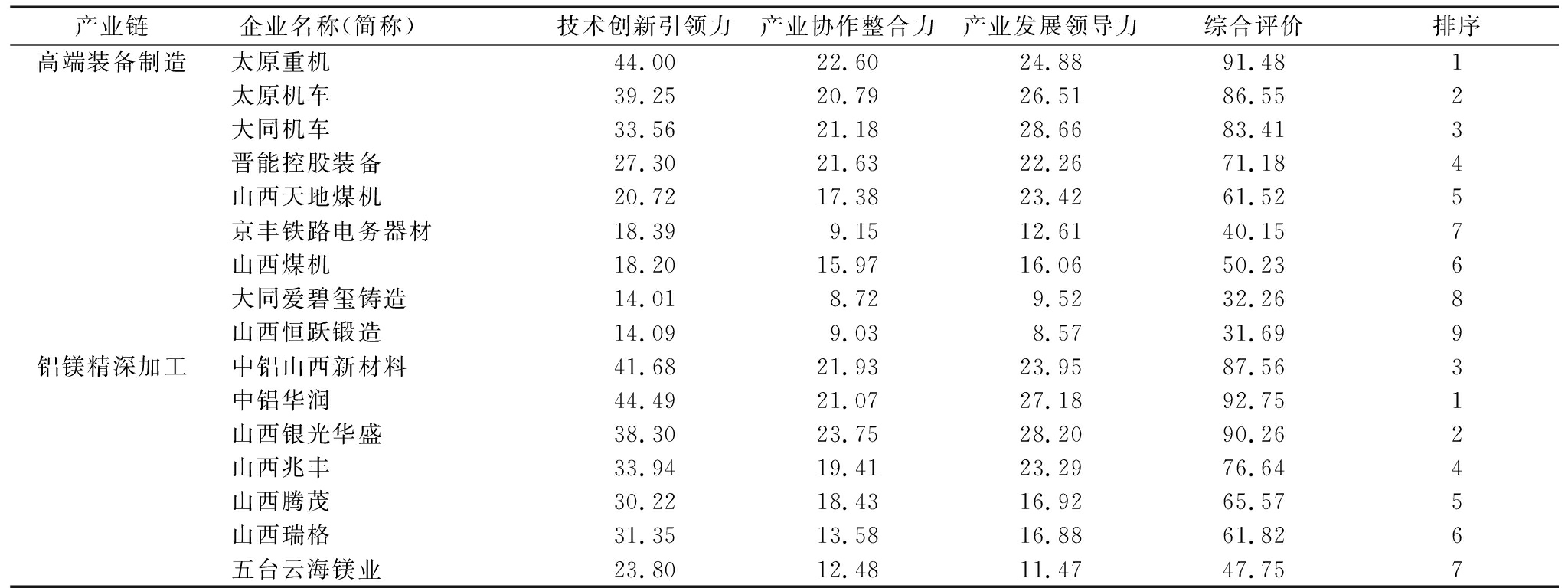 产业链企业名称(简称) 技术创新引领力产业协作整合力产业发展领导力综合评价排序高端装备制造太原重机44.0022.6024.8891.481太原机车39.2520.7926.5186.552大同机车33.5621.1828.6683.413晋能控股装备27.3021.6322.2671.184山西天地煤机20.7217.3823.4261.525京丰铁路电务器材18.399.1512.6140.157山西煤机18.2015.9716.0650.236大同爱碧玺铸造14.018.729.5232.268山西恒跃锻造14.099.038.5731.699铝镁精深加工中铝山西新材料41.6821.9323.9587.563中铝华润44.4921.0727.1892.751山西银光华盛38.3023.7528.2090.262山西兆丰33.9419.4123.2976.644山西腾茂30.2218.4316.9265.575山西瑞格31.3513.5816.8861.826五台云海镁业23.8012.4811.4747.757