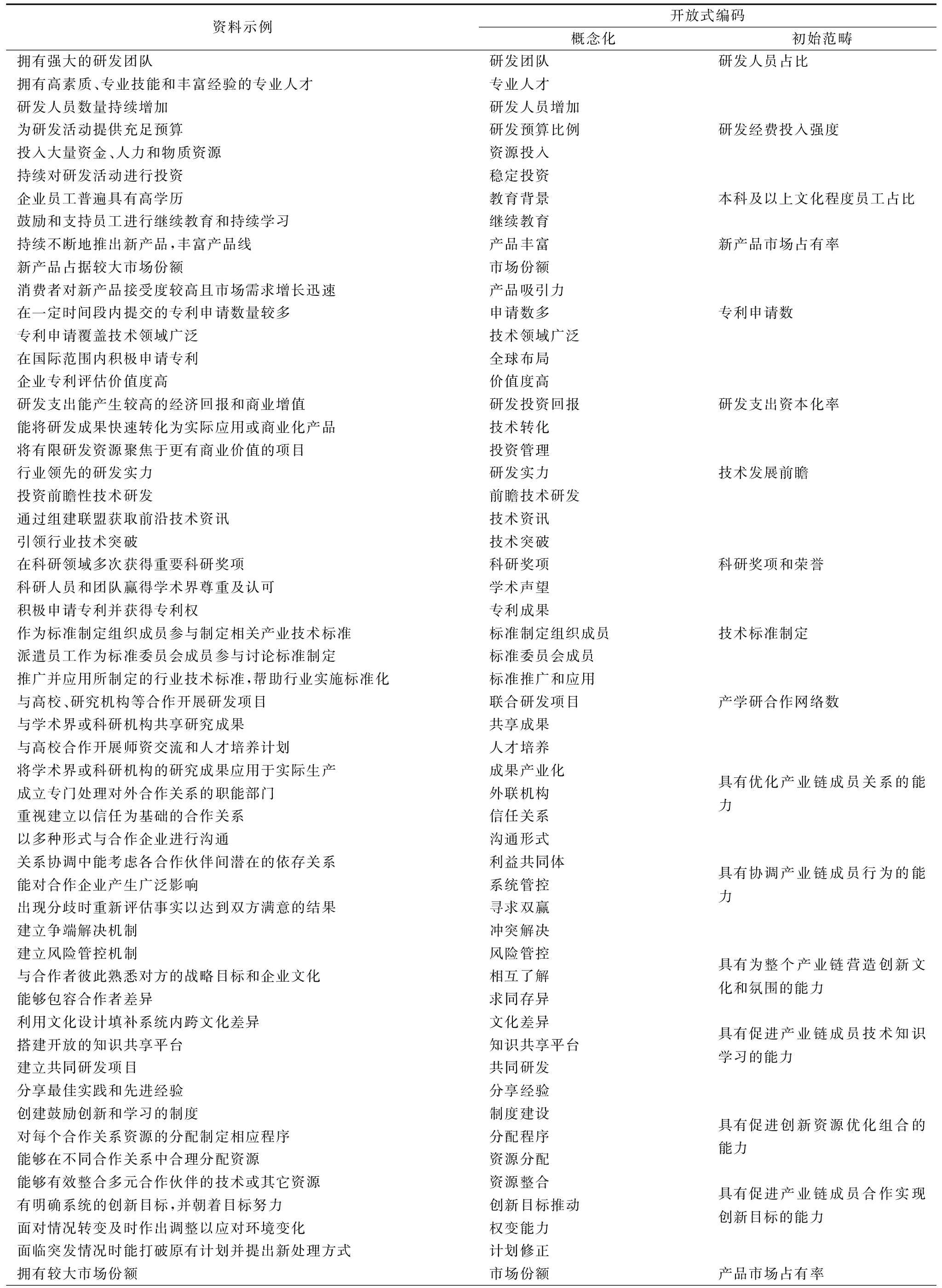 资料示例开放式编码概念化初始范畴拥有强大的研发团队研发团队研发人员占比拥有高素质、专业技能和丰富经验的专业人才专业人才研发人员数量持续增加研发人员增加为研发活动提供充足预算研发预算比例研发经费投入强度投入大量资金、人力和物质资源资源投入持续对研发活动进行投资稳定投资企业员工普遍具有高学历教育背景本科及以上文化程度员工占比鼓励和支持员工进行继续教育和持续学习继续教育持续不断地推出新产品,丰富产品线产品丰富新产品市场占有率新产品占据较大市场份额市场份额消费者对新产品接受度较高且市场需求增长迅速产品吸引力在一定时间段内提交的专利申请数量较多申请数多专利申请数专利申请覆盖技术领域广泛技术领域广泛在国际范围内积极申请专利全球布局企业专利评估价值度高价值度高研发支出能产生较高的经济回报和商业增值研发投资回报研发支出资本化率能将研发成果快速转化为实际应用或商业化产品技术转化将有限研发资源聚焦于更有商业价值的项目投资管理行业领先的研发实力研发实力技术发展前瞻投资前瞻性技术研发前瞻技术研发通过组建联盟获取前沿技术资讯技术资讯引领行业技术突破技术突破在科研领域多次获得重要科研奖项科研奖项科研奖项和荣誉科研人员和团队赢得学术界尊重及认可学术声望积极申请专利并获得专利权专利成果作为标准制定组织成员参与制定相关产业技术标准标准制定组织成员技术标准制定派遣员工作为标准委员会成员参与讨论标准制定标准委员会成员推广并应用所制定的行业技术标准,帮助行业实施标准化标准推广和应用与高校、研究机构等合作开展研发项目联合研发项目产学研合作网络数与学术界或科研机构共享研究成果共享成果与高校合作开展师资交流和人才培养计划人才培养将学术界或科研机构的研究成果应用于实际生产成果产业化成立专门处理对外合作关系的职能部门外联机构具有优化产业链成员关系的能力重视建立以信任为基础的合作关系信任关系以多种形式与合作企业进行沟通沟通形式关系协调中能考虑各合作伙伴间潜在的依存关系利益共同体能对合作企业产生广泛影响系统管控具有协调产业链成员行为的能力出现分歧时重新评估事实以达到双方满意的结果寻求双赢建立争端解决机制冲突解决建立风险管控机制风险管控与合作者彼此熟悉对方的战略目标和企业文化相互了解具有为整个产业链营造创新文化和氛围的能力能够包容合作者差异求同存异利用文化设计填补系统内跨文化差异 文化差异搭建开放的知识共享平台知识共享平台具有促进产业链成员技术知识学习的能力建立共同研发项目共同研发分享最佳实践和先进经验分享经验创建鼓励创新和学习的制度制度建设对每个合作关系资源的分配制定相应程序分配程序具有促进创新资源优化组合的能力能够在不同合作关系中合理分配资源资源分配能够有效整合多元合作伙伴的技术或其它资源资源整合有明确系统的创新目标,并朝着目标努力创新目标推动具有促进产业链成员合作实现创新目标的能力面对情况转变及时作出调整以应对环境变化权变能力面临突发情况时能打破原有计划并提出新处理方式计划修正拥有较大市场份额市场份额产品市场占有率