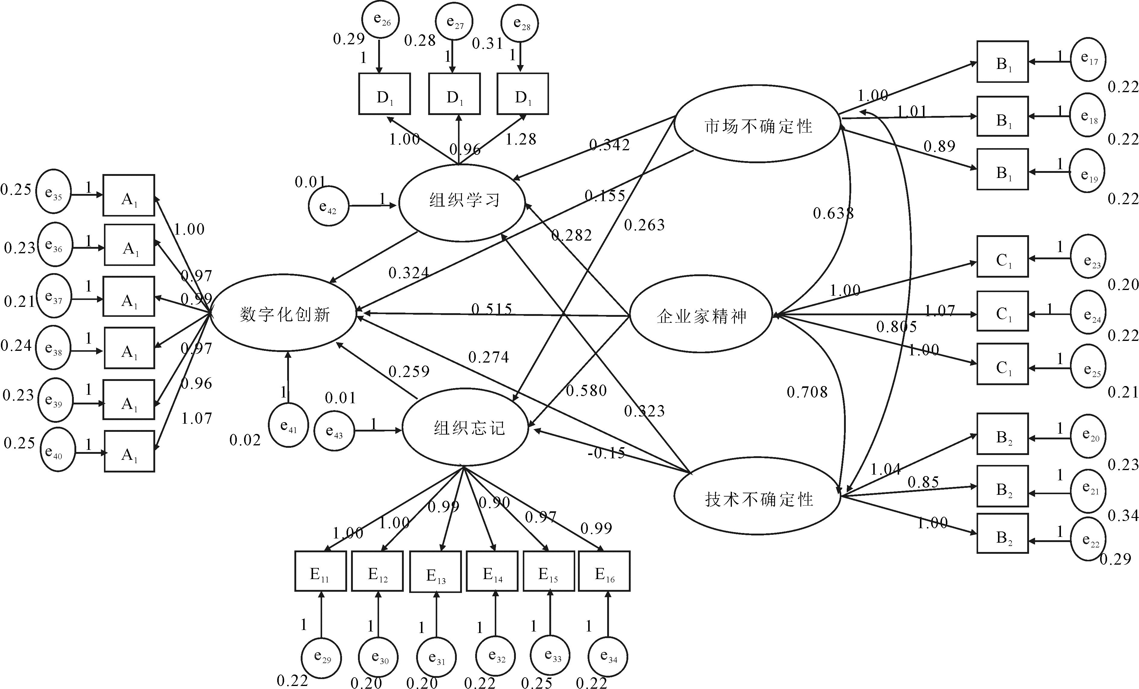 结构方程模型(SEM)路径检验结果如表4所示。由表4可知,在控制企业规模、企业性质和行业类型变量后,在95%的置信区间,市场不确定性对组织学习具有显著正向影响(β=0.342,p<0.01);市场不确定性对组织忘记具有显著正向影响(β=0.263,p<0.1);市场不确定性对数字化创新具有显著正向影响(β=0.155,p<0.01);技术不确定性对组织学习具有显著正向影响(β=0.323,p<0.01);技术不确定性对组织忘记的影响不显著(β=-0.152,p>0.1),原因可能在于:高度不确定性环境下,企业难以识别什么技术对自身有用以及什么是失效技术,因而技术不确定性无法对组织忘记发挥正向促进作用;技术不确定性对数字化创新具有显著正向影响(β=0.274,p<0.01);企业家精神对组织学习具有显著正向影响(β=0.282,p<0.01);企业家精神对组织忘记具有显著正向影响(β=0.580,p<0.01);企业家精神对数字化创新具有显著正向影响(β=0.515,p<0.01);组织学习对组织忘记具有显著正向影响(β=0.460,p<0.1);组织学习对数字化创新具有显著正向影响(β=0.324,p<0.01);组织忘记对数字化创新具有显著正向影响(β=0.259,p<0.1)。本文结构方程模型检验结果如图2所示。