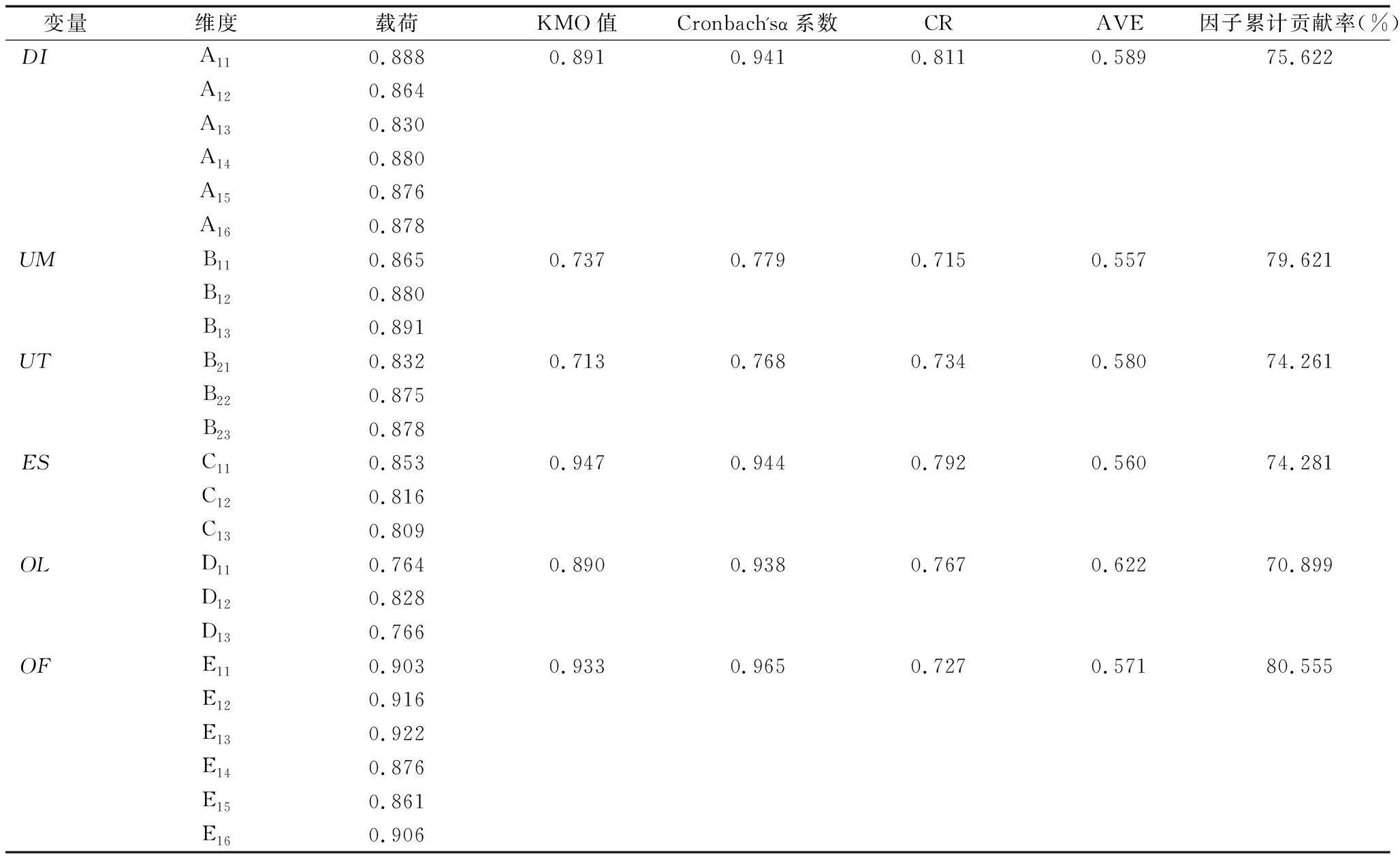 变量维度载荷KMO值Cronbach'sα系数CRAVE因子累计贡献率(%)DIA110.8880.8910.9410.8110.58975.622A120.864A130.830A140.880A150.876A160.878UMB110.8650.7370.7790.7150.55779.621B120.880B130.891UTB210.8320.7130.7680.7340.58074.261B220.875B230.878ESC110.8530.9470.9440.7920.56074.281C120.816C130.809OLD110.7640.8900.9380.7670.62270.899D120.828D130.766OFE110.9030.9330.9650.7270.57180.555E120.916E130.922E140.876E150.861E160.906