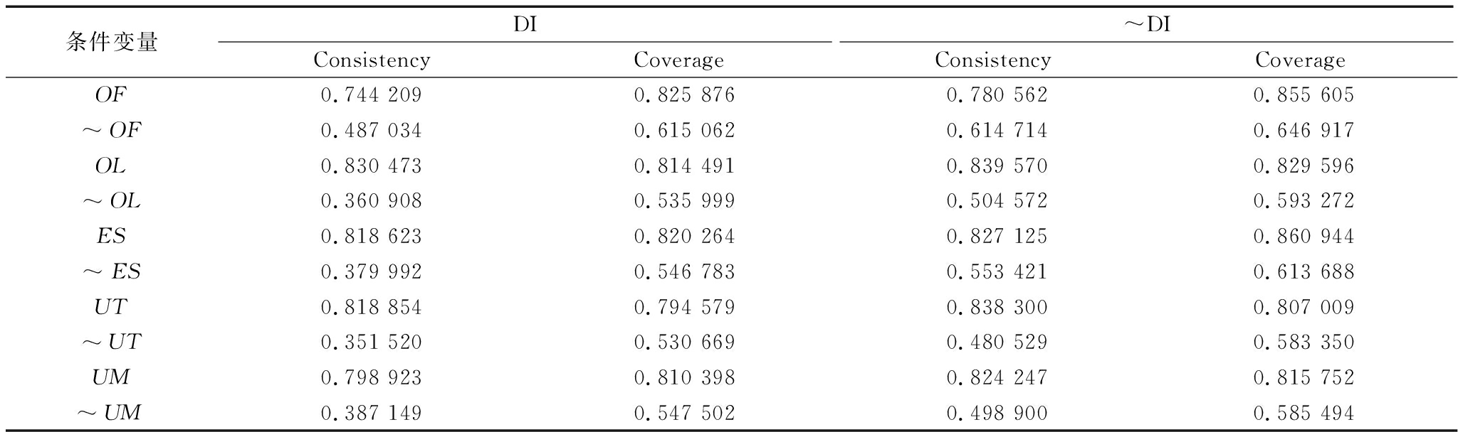 条件变量DIConsistencyCoverage~DIConsistencyCoverageOF0.744 2090.825 8760.780 5620.855 605~OF0.487 0340.615 0620.614 7140.646 917OL0.830 4730.814 4910.839 5700.829 596~OL0.360 9080.535 9990.504 5720.593 272ES0.818 6230.820 2640.827 1250.860 944~ES0.379 9920.546 7830.553 4210.613 688UT0.818 8540.794 5790.838 3000.807 009~UT0.351 5200.530 6690.480 5290.583 350UM0.798 9230.810 3980.824 2470.815 752~UM0.387 1490.547 5020.498 9000.585 494