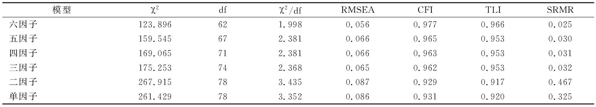 模型χ2dfχ2/dfRMSEACFITLISRMR六因子123.896621.9980.0560.9770.9660.025五因子159.545672.3810.0660.9650.9530.030四因子169.065712.3810.0660.9630.9530.031三因子175.253742.3680.0650.9620.9530.032二因子267.915783.4350.0870.9290.9170.467单因子261.429783.3520.0860.9310.9200.325