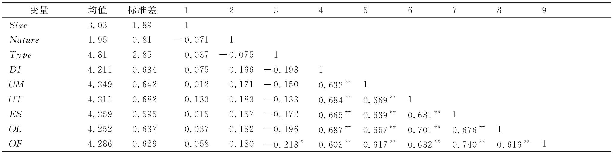 变量均值标准差123456789Size3.031.891Nature1.950.81-0.0711Type4.812.850.037-0.0751DI4.2110.6340.0750.166-0.1981UM4.2490.6420.0120.171-0.1500.633**1UT4.2110.6820.1330.183-0.1330.684**0.669**1ES4.2590.5950.0150.157-0.1720.665**0.639**0.681**1OL4.2520.6370.0370.182-0.1960.687**0.657**0.701**0.676**1OF4.2860.6290.0580.180-0.218*0.603**0.617**0.632**0.740**0.616**1