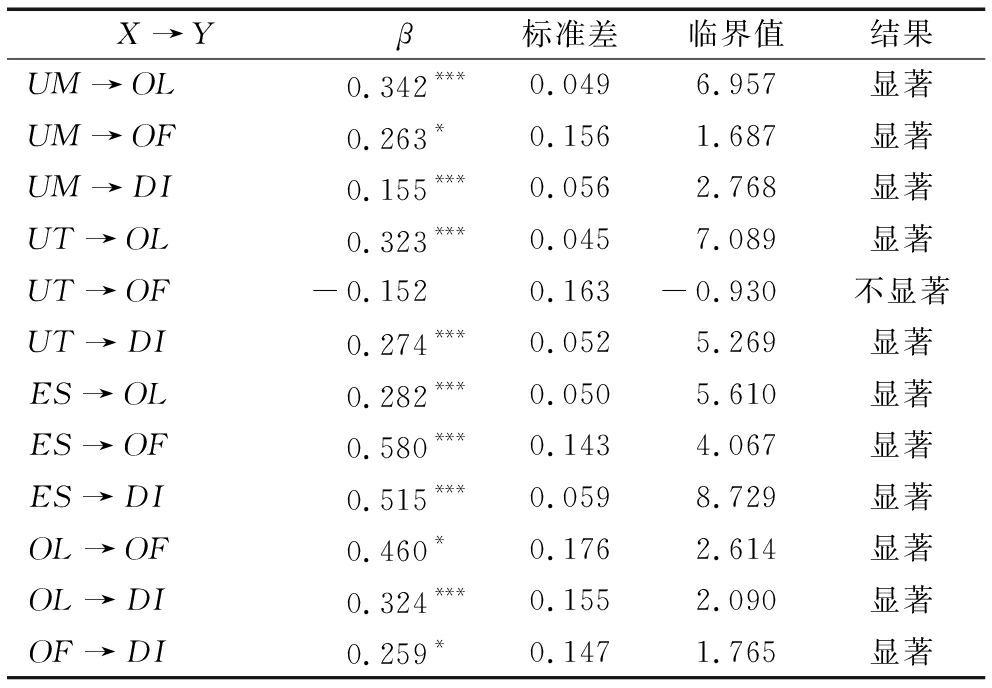 X→Yβ标准差临界值结果UM→OL0.342***0.0496.957显著UM→OF0.263*0.1561.687显著UM→DI0.155***0.0562.768显著UT→OL0.323***0.0457.089显著UT→OF-0.1520.163-0.930不显著UT→DI0.274***0.0525.269显著ES→OL0.282***0.0505.610显著ES→OF0.580***0.1434.067显著ES→DI0.515***0.0598.729显著OL→OF0.460*0.1762.614显著OL→DI0.324***0.1552.090显著OF→DI0.259*0.1471.765显著