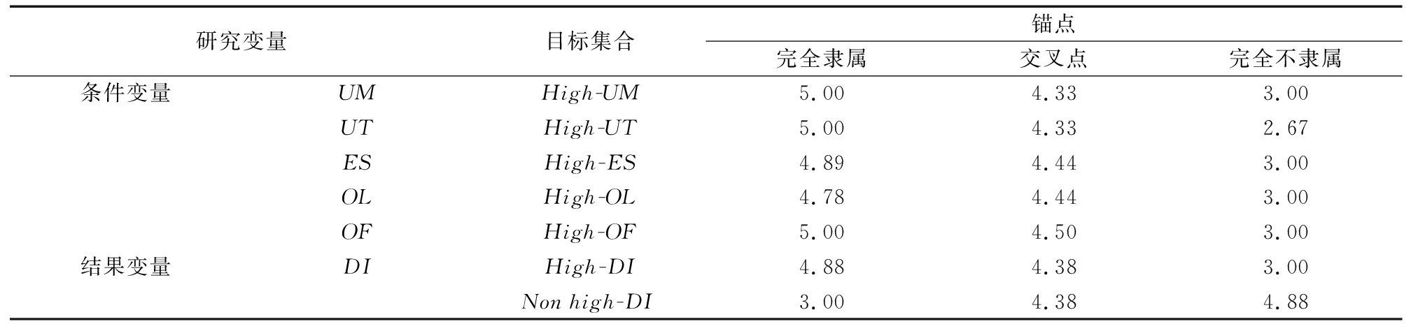 研究变量目标集合锚点完全隶属交叉点完全不隶属条件变量UMHigh-UM5.004.333.00UTHigh-UT5.004.332.67ESHigh-ES4.894.443.00OLHigh-OL4.784.443.00OFHigh-OF5.004.503.00结果变量DIHigh-DI4.884.383.00Non high-DI3.004.384.88