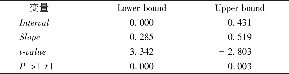 变量Lower boundUpper boundInterval0.0000.431Slope0.285-0.519t-value3.342-2.803P>|t|0.0000.003