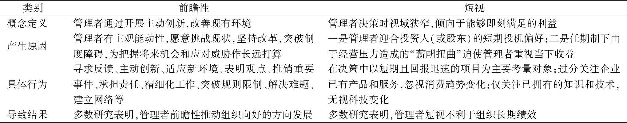表1 概念对比:管理者前瞻性与管理者短视异同