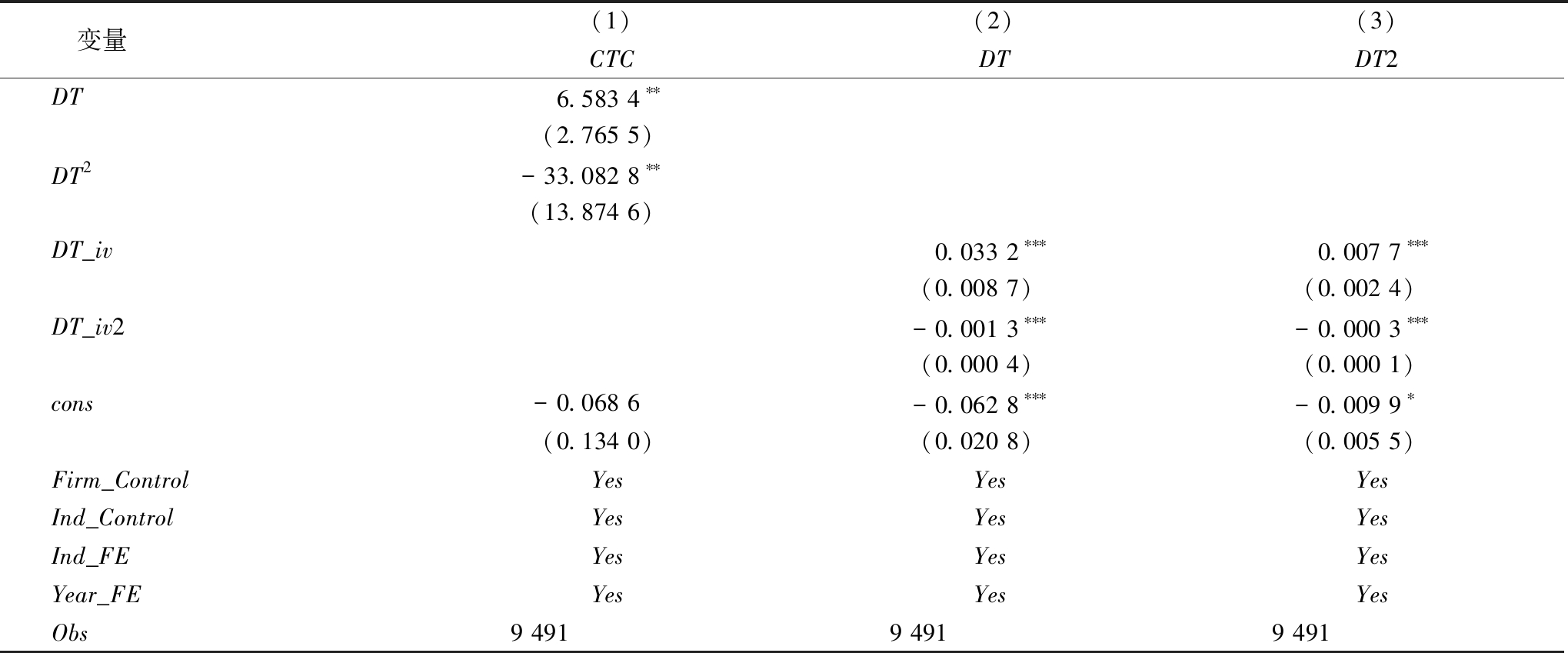 变量(1)(2)(3)CTCDTDT2DT6.583 4∗∗(2.765 5)DT2-33.082 8∗∗(13.874 6)DT_iv0.033 2∗∗∗0.007 7∗∗∗(0.008 7)(0.002 4)DT_iv2-0.001 3∗∗∗-0.000 3∗∗∗(0.000 4)(0.000 1)cons-0.068 6-0.062 8∗∗∗-0.009 9∗(0.134 0)(0.020 8)(0.005 5)Firm_ControlYesYesYesInd_ControlYesYesYesInd_FEYesYesYesYear_FEYesYesYesObs9 4919 4919 491