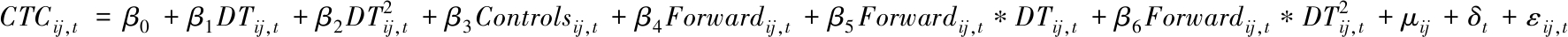 其中,被解释变量CTCij,t表示j城市企业i第t年核心技术能力,核心解释变量DTij,t表示j城市企业i第t年数字化转型程度,DT2ij,t为企业数字化转型平方项。Controlsij,t表示一系列控制变量。此外,μij、δt分别表示行业固定效应和时间固定效应,εij,t为随机扰动项。在所有回归方程中,默认采用聚类标准误并将其调整至企业层面。