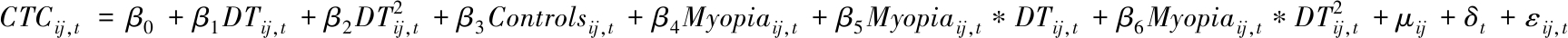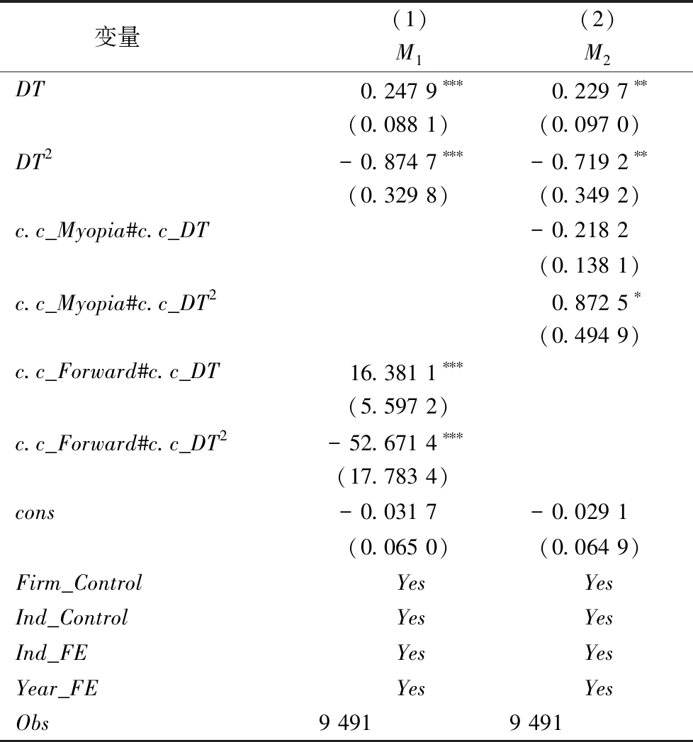 变量(1)(2)M1M2DT0.247 9∗∗∗0.229 7∗∗(0.088 1)(0.097 0)DT2-0.874 7∗∗∗-0.719 2∗∗(0.329 8)(0.349 2)c.c_Myopia#c.c_DT-0.218 2(0.138 1)c.c_Myopia#c.c_DT20.872 5∗(0.494 9)c.c_Forward#c.c_DT16.381 1∗∗∗(5.597 2)c.c_Forward#c.c_DT2-52.671 4∗∗∗(17.783 4)cons-0.031 7-0.029 1(0.065 0)(0.064 9)Firm_ControlYesYesInd_ControlYesYesInd_FEYesYesYear_FEYesYesObs9 4919 491