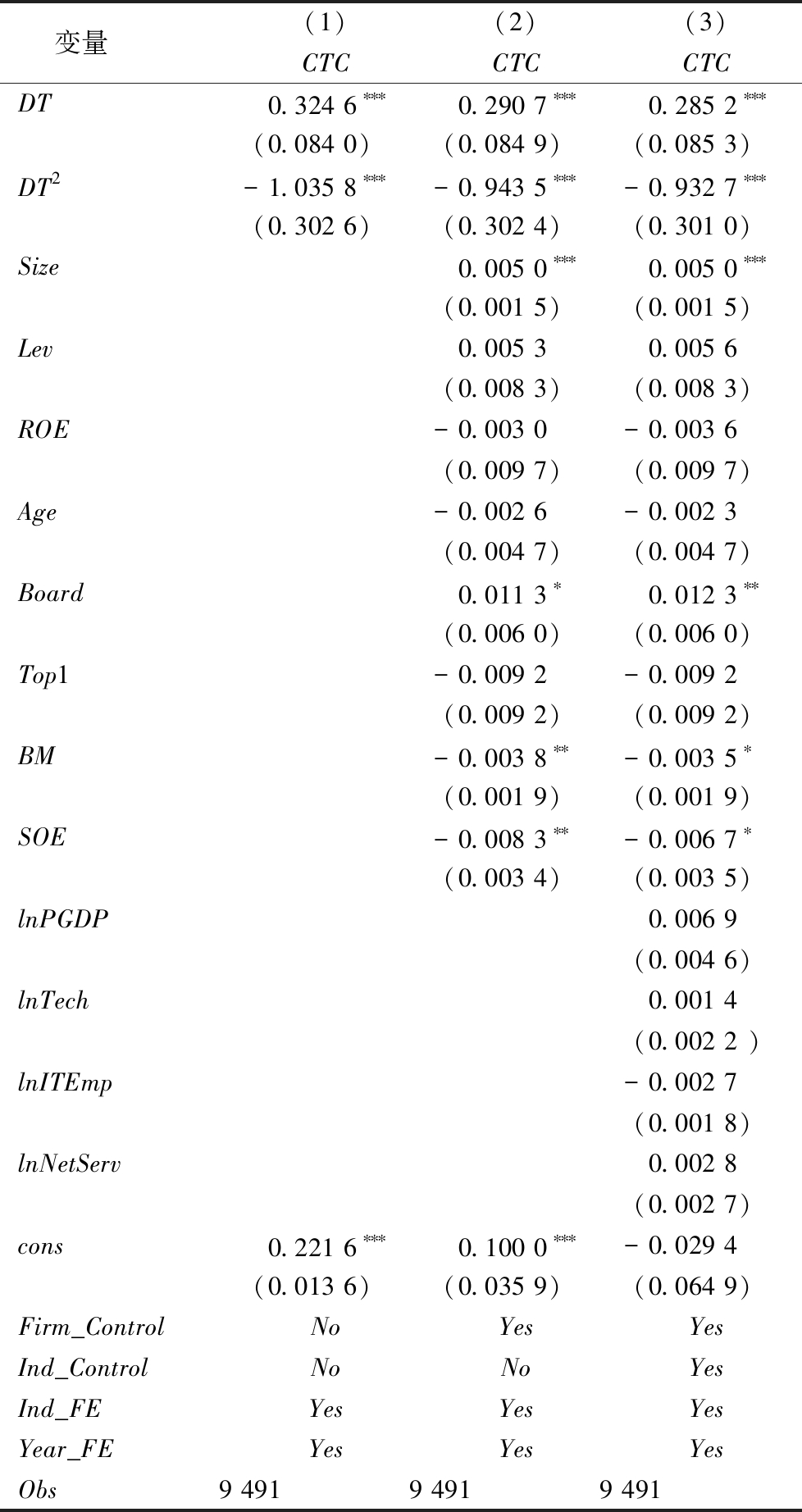 变量(1)(2)(3)CTCCTCCTCDT0.324 6∗∗∗0.290 7∗∗∗0.285 2∗∗∗(0.084 0)(0.084 9)(0.085 3)DT2-1.035 8∗∗∗-0.943 5∗∗∗-0.932 7∗∗∗(0.302 6)(0.302 4)(0.301 0)Size0.005 0∗∗∗0.005 0∗∗∗(0.001 5)(0.001 5)Lev0.005 30.005 6(0.008 3)(0.008 3)ROE-0.003 0-0.003 6(0.009 7)(0.009 7)Age-0.002 6-0.002 3(0.004 7)(0.004 7)Board0.011 3∗0.012 3∗∗(0.006 0)(0.006 0)Top1-0.009 2-0.009 2(0.009 2)(0.009 2)BM-0.003 8∗∗-0.003 5∗(0.001 9)(0.001 9)SOE-0.008 3∗∗-0.006 7∗(0.003 4)(0.003 5)lnPGDP0.006 9(0.004 6)lnTech0.001 4 (0.002 2 )lnITEmp-0.002 7(0.001 8)lnNetServ0.002 8(0.002 7)cons0.221 6∗∗∗0.100 0∗∗∗-0.029 4(0.013 6)(0.035 9)(0.064 9)Firm_ControlNoYesYesInd_ControlNoNoYesInd_FEYesYesYesYear_FEYesYesYesObs9 4919 4919 491