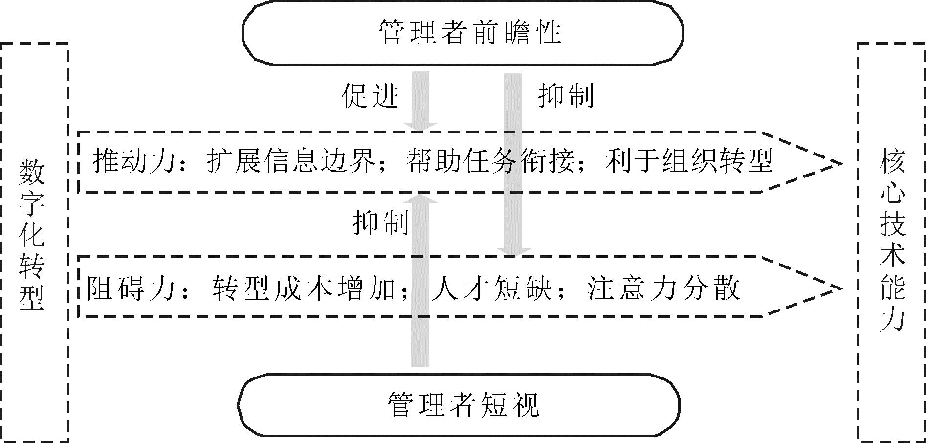 企业通过数字化转型驱动核心技术能力提升的重要性不言而喻,但相关研究较为匮乏。首先,尚未明确企业数字化转型与核心技术能力间的关系。Lanzolla等(2020)认为,数字化转型能够帮助企业更好地发现、认知、整合现有知识,进而促进企业核心技术能力提升;Hilbolling等(2020)认为,随着企业数字化进程深入推进,企业内部反复“优化”不利于核心技术能力培育。因此,现有研究表明,除“非此即彼”的线性关系外,数字化转型与核心技术能力也可能存在非线性关系(刘淑春等,2021)。其次,从战略角度看,企业是人的组织(苏芳, 毛基业,2019;罗瑾琏等,2018),无论是实施数字化转型还是提升核心技术能力都需要依靠管理者推动。特别是管理者时间导向(管理者前瞻性与管理者短视)既能塑造企业当前行为,又能决定企业未来发展方向(胡楠等,2021)。脱离管理者时间导向分析数字化转型与核心技术能力的关系容易以偏概全,仅关注时间导向与核心技术能力的关系又缺乏对数字经济这一背景的认知,不具有理论意义。现有研究尚未揭示数字化、核心技术、管理者时间导向三者间的关系。由此,有必要针对三者间的关系作进一步研究。