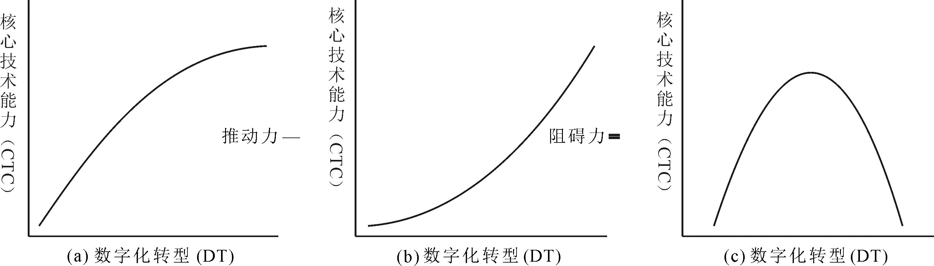 虽然数字化转型可为企业核心技术能力提供多方面帮助,但需要注意的是,企业数字技术发展遵循边际效应递减规律。这是因为任何企业发展都遵循路径依赖,并不断对已有模式进行强化[10]。路径依赖会导致企业开展渐进式创新而非突破式创新,如此一来,企业发展趋于平缓。从推动力视角看,企业数字化转型与核心技术能力呈正相关但边际效应递减的关系,如图1a所示。此外,数字化转型对核心技术发展具有一定的阻碍,这种阻碍主要表现在3个方面: