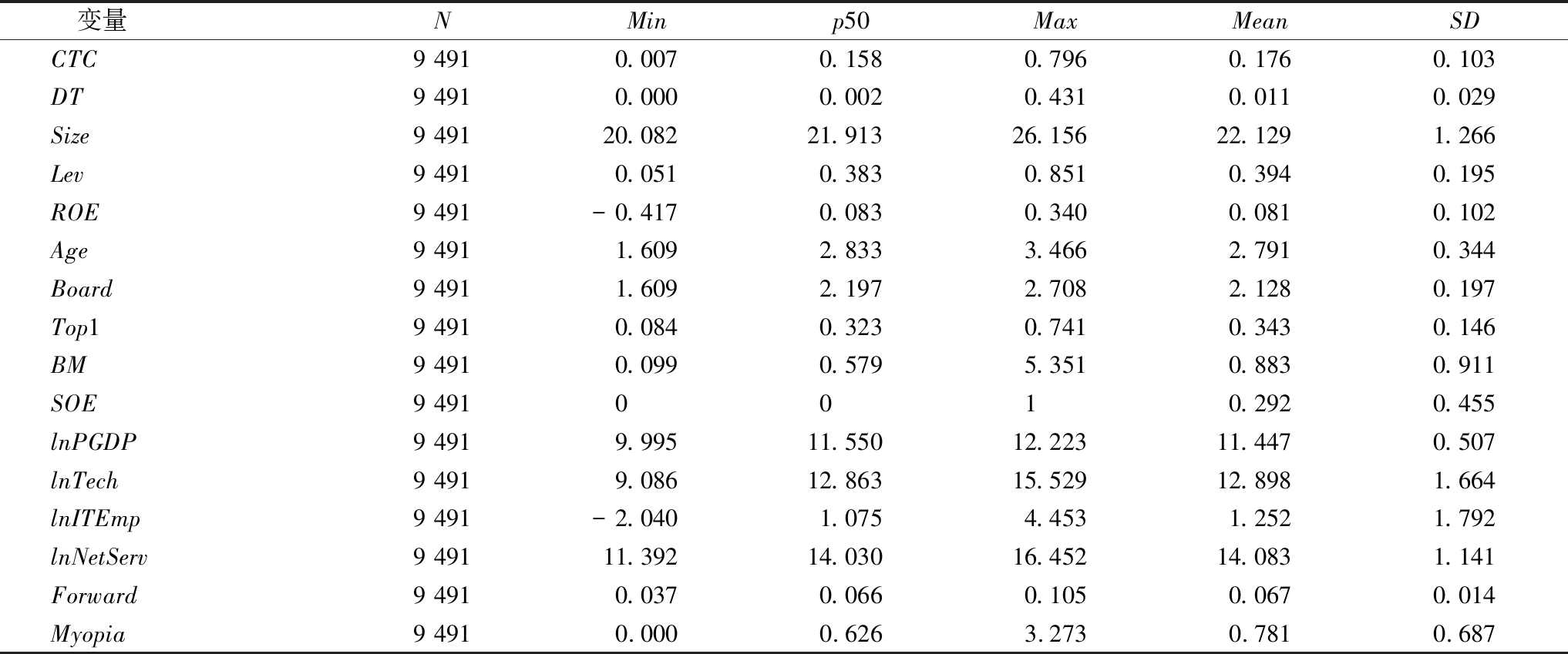 本文选取企业与区域两个层面的指标作为控制变量。其中,企业层面控制变量包括企业规模(Size)、资产负债率(Lev)、净资产收益率(ROE)、成立年限(Age)、董事会规模(Board)、第一大股东持股比例(Top1)、账面市值比(BM)以及是否为国企(SOE)。区域层面控制变量包括人均GDP(lnPGDP)、科学技术支出(lnTech)、信息传输计算机服务和软件业从业人员数(lnITEmp)和电信业务总量(lnNetServ)。