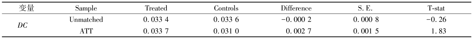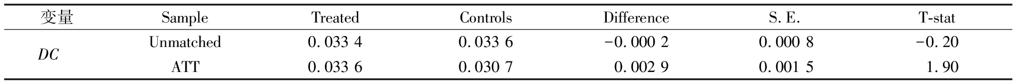 变量SampleTreatedControlsDifferenceS.E.T-statDCUnmatched0.033 40.033 6-0.000 20.000 8-0.26ATT0.033 70.031 00.002 70.001 51.83