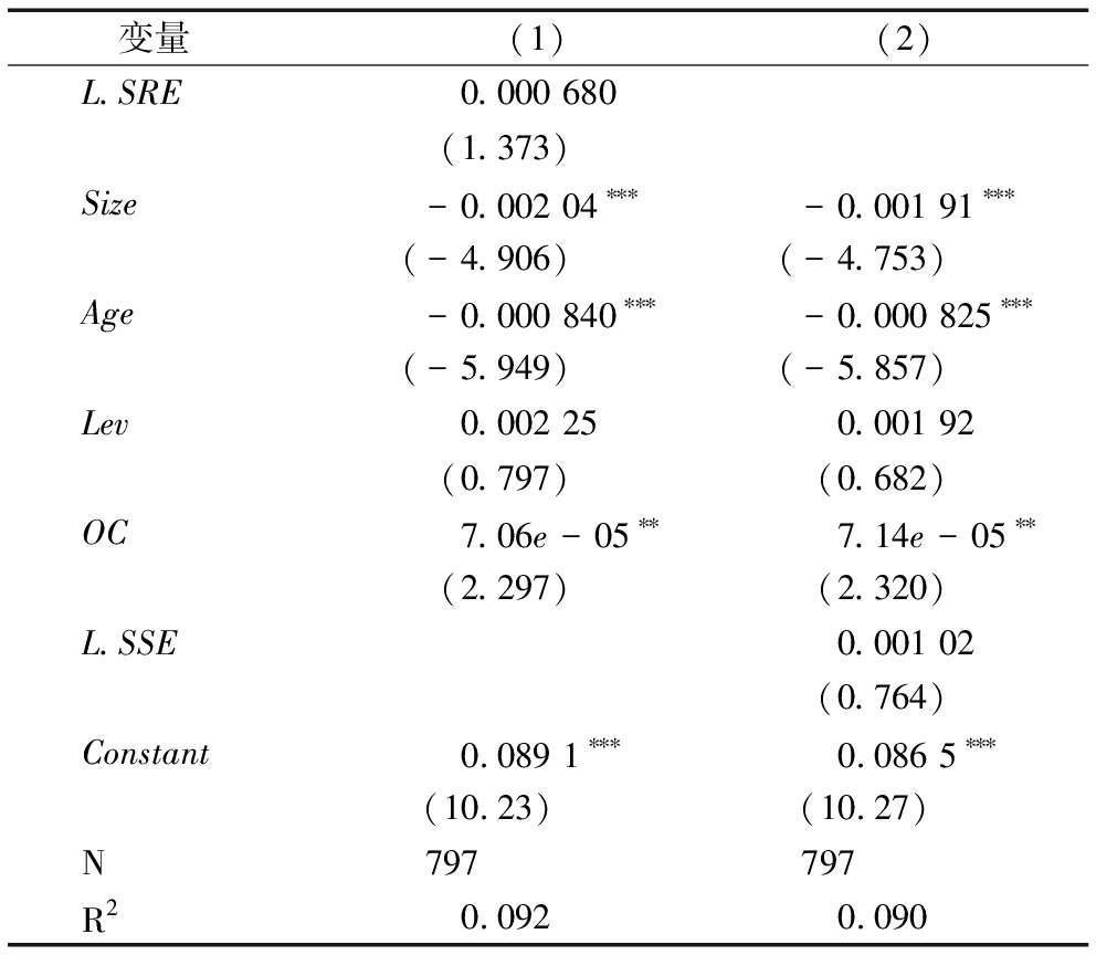 变量(1)(2)L.SRE0.000 680(1.373)Size-0.002 04∗∗∗-0.001 91∗∗∗(-4.906)(-4.753)Age-0.000 840∗∗∗-0.000 825∗∗∗(-5.949)(-5.857)Lev0.002 250.001 92(0.797)(0.682)OC7.06e-05∗∗7.14e-05∗∗(2.297)(2.320)L.SSE0.001 02(0.764)Constant0.089 1∗∗∗0.086 5∗∗∗(10.23)(10.27)N797797R20.0920.090