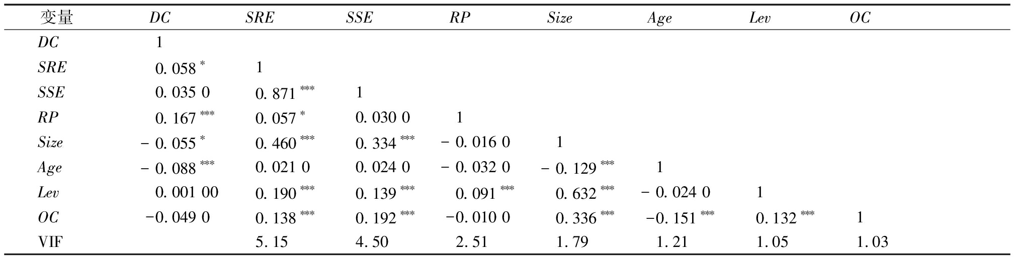 变量DCSRESSERPSizeAgeLevOCDC1SRE0.058∗1SSE0.035 00.871∗∗∗1RP0.167∗∗∗0.057∗0.030 01Size-0.055∗0.460∗∗∗0.334∗∗∗-0.016 01Age-0.088∗∗∗0.021 00.024 0-0.032 0-0.129∗∗∗1Lev0.001 000.190∗∗∗0.139∗∗∗0.091∗∗∗0.632∗∗∗-0.024 01OC-0.049 00.138∗∗∗0.192∗∗∗-0.010 00.336∗∗∗-0.151∗∗∗0.132∗∗∗1VIF5.154.502.511.791.211.051.03