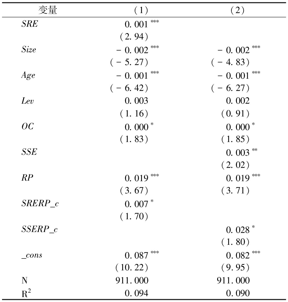 其中,SRERP_c、SSERP_c分别为通过对自变量、调整变量去中心化处理后相乘得到的相互作用变量,其系数显著性程度能够直观地反映风险偏好的调节作用。