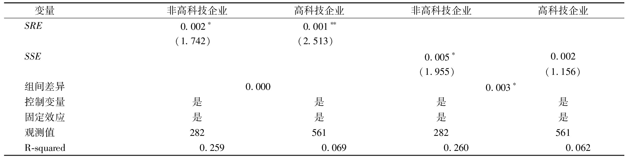 变量非高科技企业高科技企业非高科技企业高科技企业SRE0.002∗0.001∗∗(1.742)(2.513)SSE0.005∗0.002(1.955)(1.156)组间差异0.0000.003∗控制变量是是是是固定效应是是是是观测值282561282561R-squared0.2590.0690.2600.062