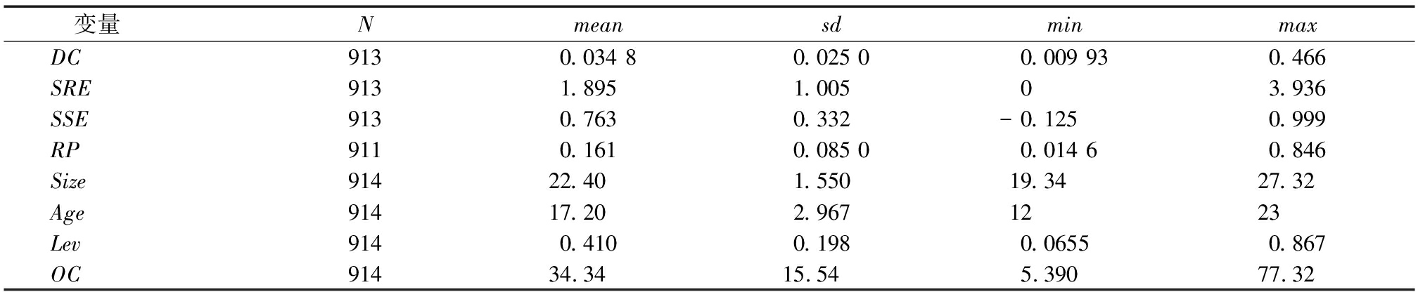 变量NmeansdminmaxDC9130.034 80.025 00.009 930.466SRE9131.8951.00503.936SSE9130.7630.332-0.1250.999RP9110.1610.085 00.014 60.846Size91422.401.55019.3427.32Age91417.202.9671223Lev9140.4100.1980.06550.867OC91434.3415.545.39077.32