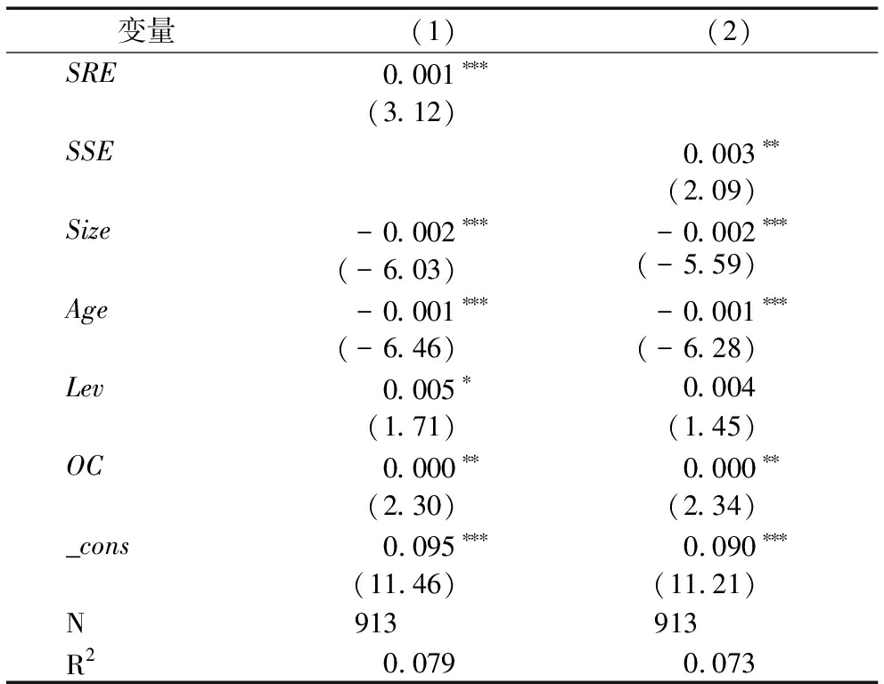 变量(1)(2)SRE0.001∗∗∗(3.12)SSE0.003∗∗(2.09)Size-0.002∗∗∗-0.002∗∗∗(-6.03)(-5.59)Age-0.001∗∗∗-0.001∗∗∗(-6.46)(-6.28)Lev0.005∗0.004(1.71)(1.45)OC0.000∗∗0.000∗∗(2.30)(2.34)_cons0.095∗∗∗0.090∗∗∗(11.46)(11.21)N913913R20.0790.073