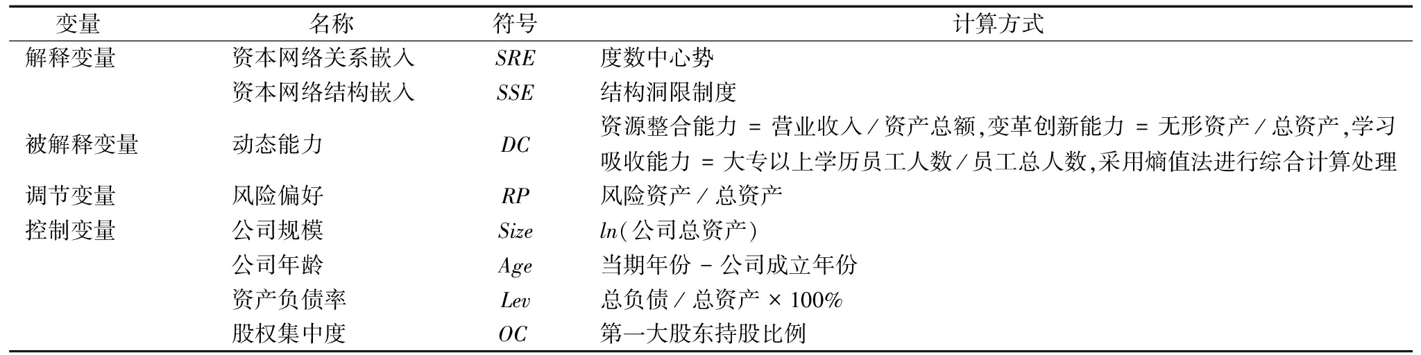 变量名称符号计算方式解释变量资本网络关系嵌入SRE度数中心势资本网络结构嵌入SSE结构洞限制度被解释变量动态能力DC资源整合能力=营业收入/资产总额,变革创新能力=无形资产/总资产,学习吸收能力=大专以上学历员工人数/员工总人数,采用熵值法进行综合计算处理调节变量风险偏好RP风险资产/总资产控制变量公司规模Sizeln(公司总资产)公司年龄Age当期年份-公司成立年份资产负债率Lev总负债/总资产×100%股权集中度OC第一大股东持股比例